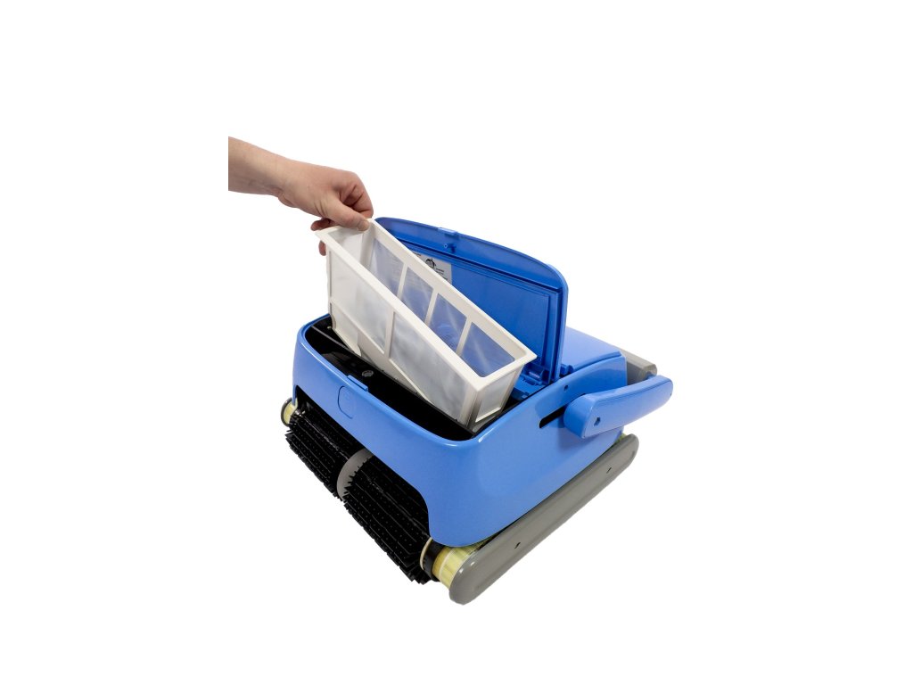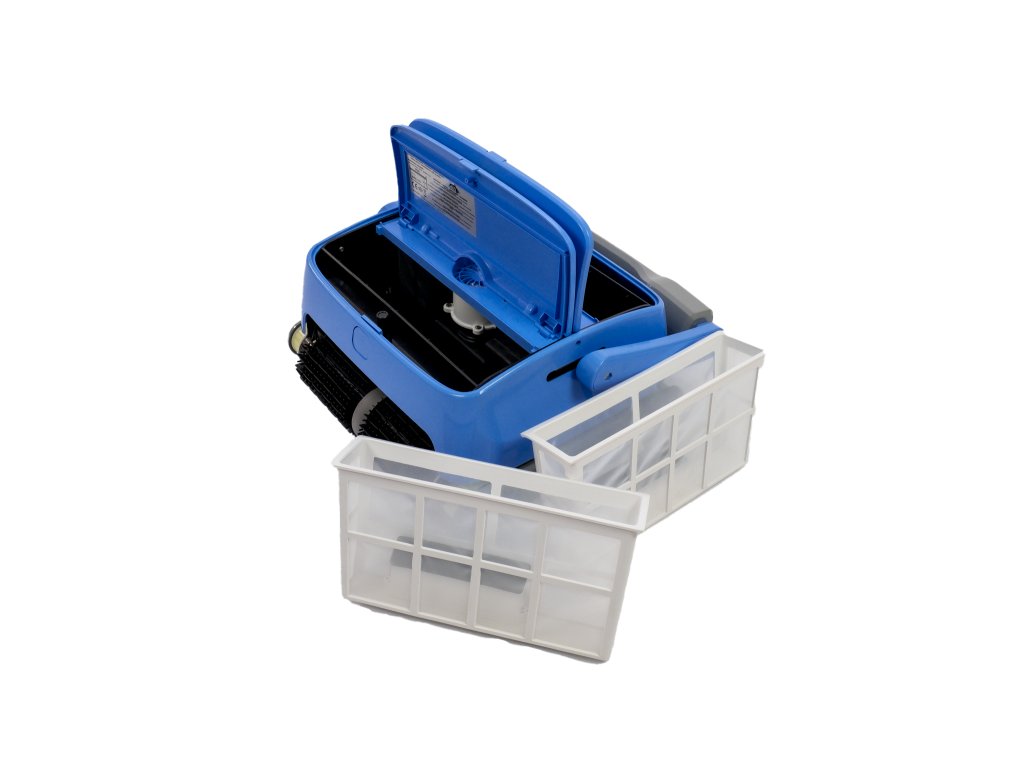Nečistoty sa zachytávajú v dvoch filtračných kazetách (košiach) prístupných zhora. Vďaka jemnosti filtračných košov (180 mikrónov) vysávač vysaje aj veľmi drobné nečistoty a vy tak budete mať žiarivo čistý bazén. Pohybom vysávača navyše dochádza k jemnému víreniu vody, čím sa výrazne zlepšuje jej kvalita a znižuje sa spotreba prípravkov na starostlivosť o vodu. Vyčistenie AKU vysávača Orca 300 AKU je hračka. Filtračné koše jednoducho vysuniete z hornej časti, vyprázdnite ich a opláchnete ich pod tečúcou vodou. A vysávač je opäť pripravený na ďalšie čistenie.