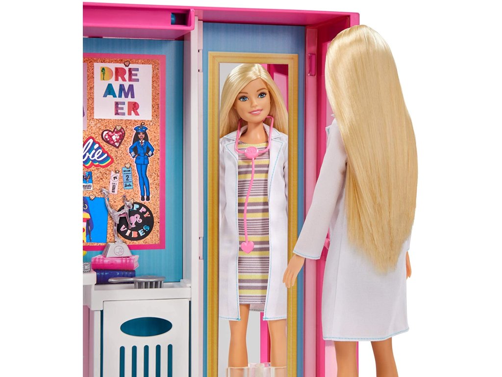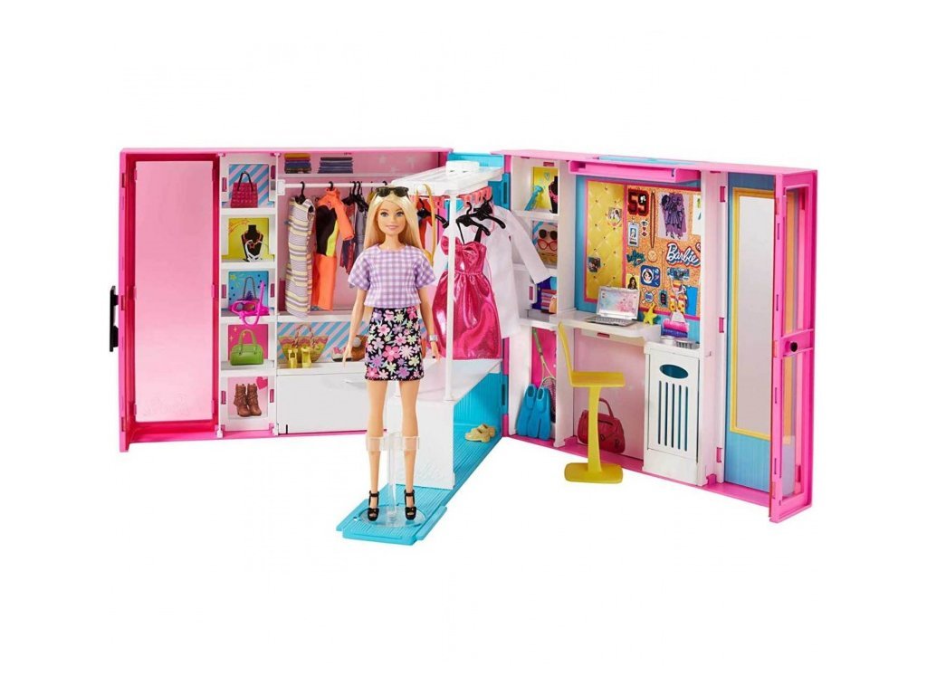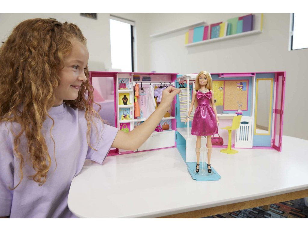 Barbie® šatník snov je splneným snom všetkých milovníčok módy! Si pripravená odhaliť, čo šatník ukrýva? Vnútri šatníka na teba čaká herná plocha a dostatok úložného priestoru pre bábiku Barbie® a viac ako 25 jej vecí, doplnkov a oblečkov . Nechýbajú samozrejme ani skrinky, poličky alebo šatníková tyč.