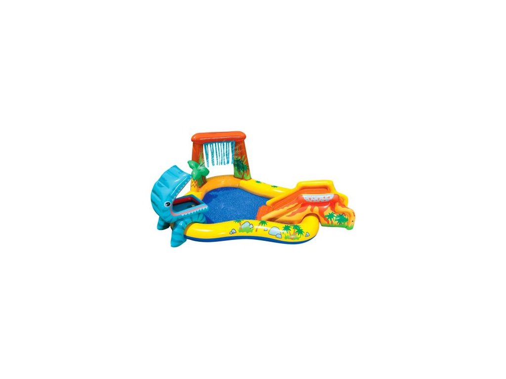 Dinosaurie nafukovacie centrum . Skĺznutie po sopečnej šmykľavke priamo do vodnej džungle? Kŕmenie dinosaura alebo tropický dážď? Originálne a zábavné hracie centrum zavedie vaše deti rovno do raja. Užite si spoločne s nimi zábavu plnú osvieženia.