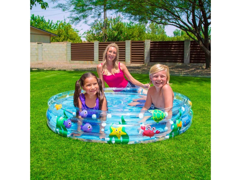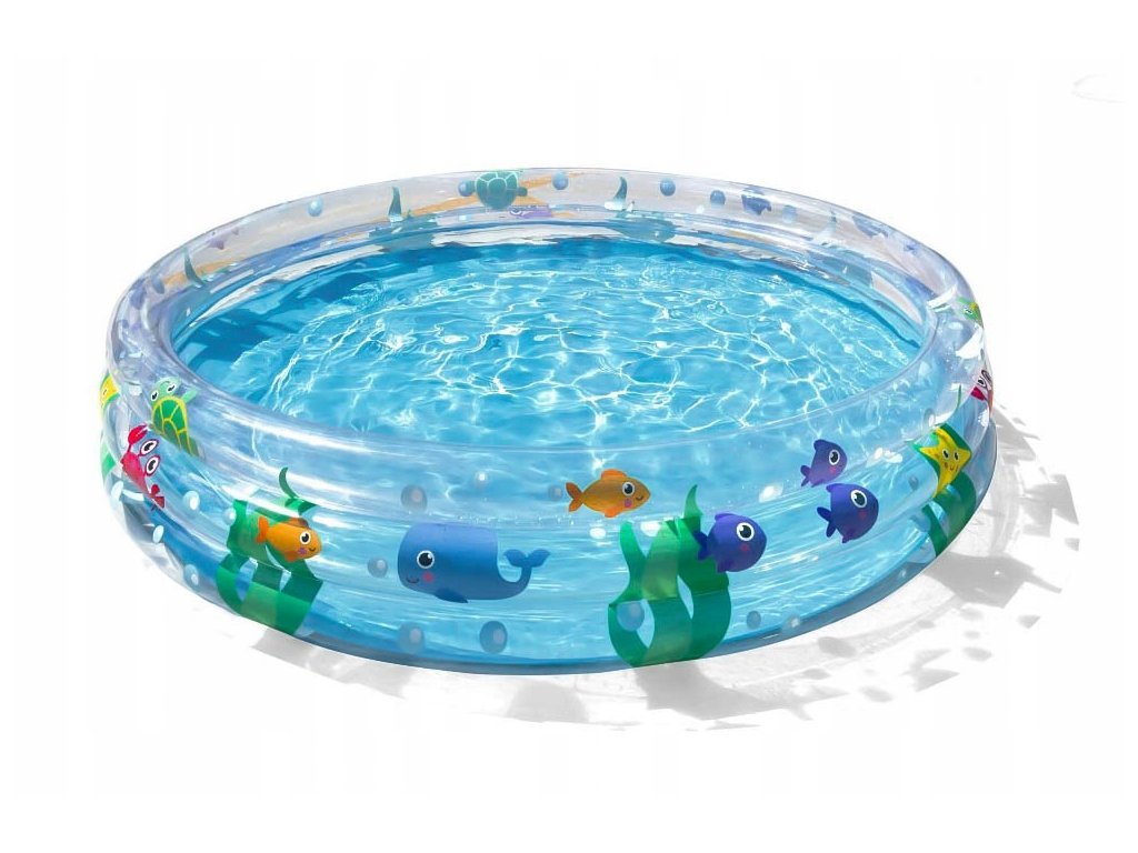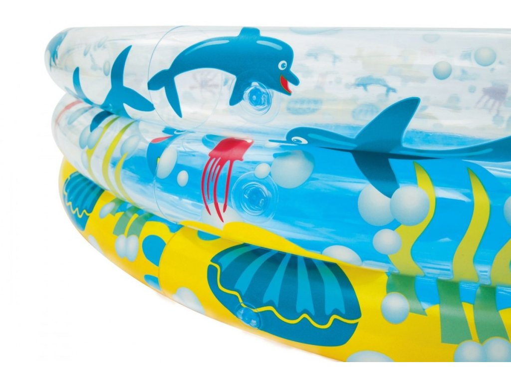 Nafukovací bazén s potlačou morského sveta. Bazén má tri samostatne nafukovacie prstence, ktoré sú zabezpečené proti nechcenému úniku vzduchu. Súčasťou dodávky je sada na zalepenie drobných dier.