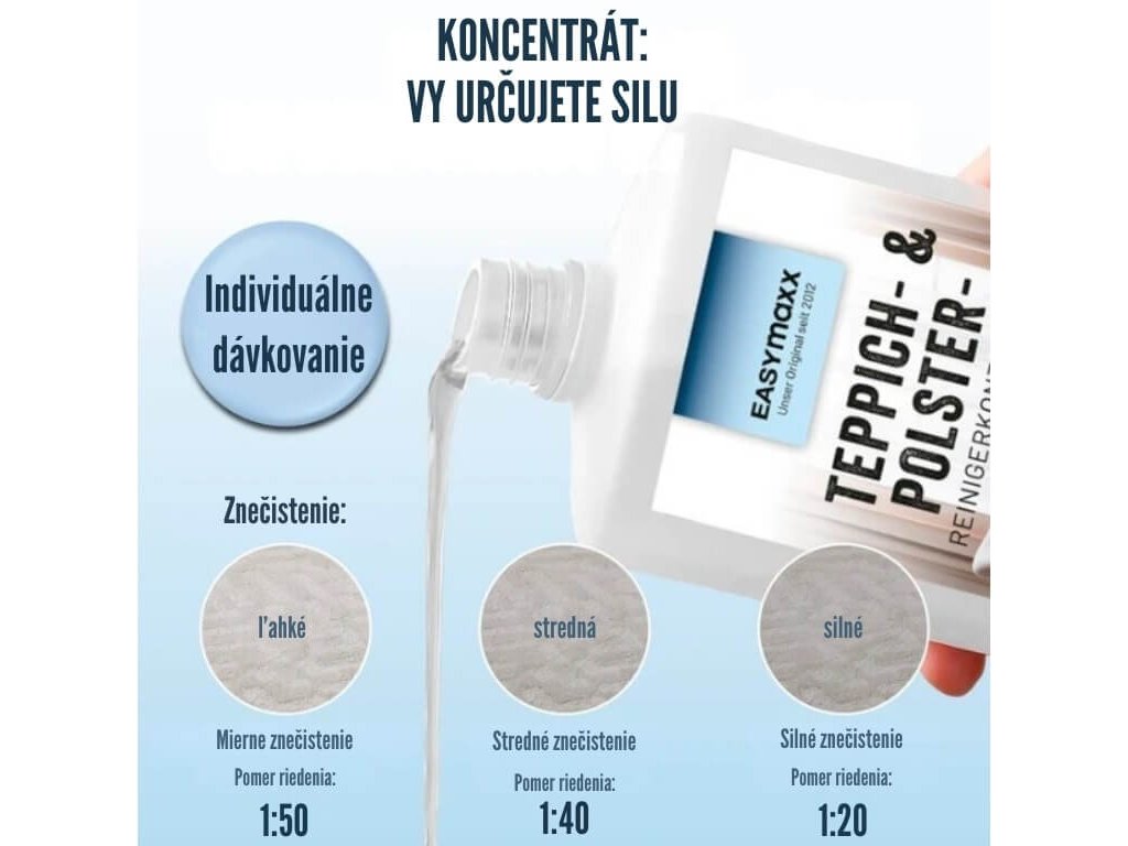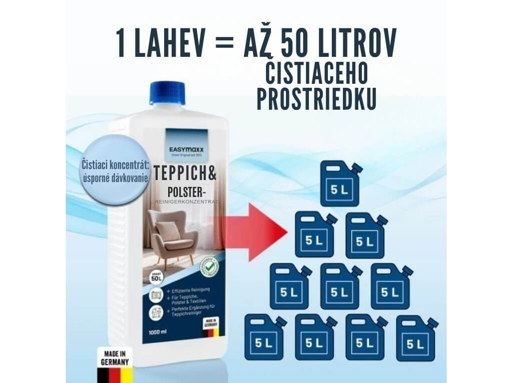 S koncentrovaným čističom kobercov a čalúnenie EASYmaxx premeníte čalúnenie, koberce a textilné povrchy v čisté a pohodlné priestory behom chvíľky ! Tento účinný čistiaci koncentrát vyrobený v Nemecku je ideálny pre použitie s čističmi kobercov CLEANmaxx , mokrými vysávačmi iných výrobcov alebo dokonca ručne. Či už sa jedná o pohovku, kreslo, koberec alebo autosedačku - koncentrát bez znečisťujúcich látok spoľahlivo odstraňuje aj škvrny, ako je červené víno, káva alebo mastnota, a zanecháva po sebe len svieži pocit.