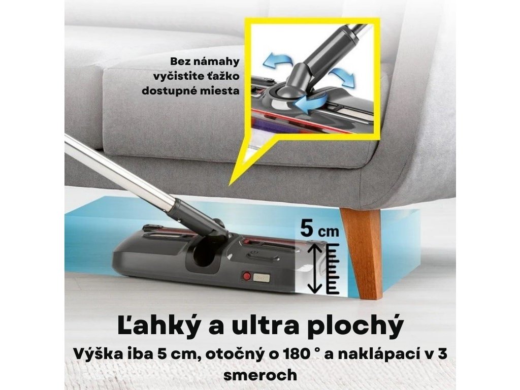 Zabudnite na vrecká! Zametač je vybavený 300 ml nádobou na nečistoty, ktorú jednoducho vyprázdnite stlačením tlačidla. Čistiaci proces je tak rýchly a bez námahy. Navyše, vďaka stojacej funkcii, môžete zametač ľahko odložiť bez toho, aby sa prevrátil.