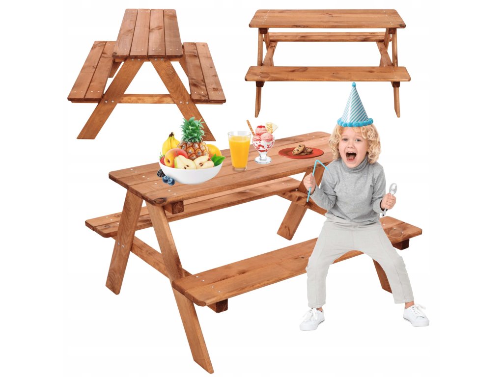- Robustná konštrukcia: Súprava zahŕňa pevný stôl s pevne pripojenými lavicami, ktoré poskytujú stabilné a bezpečné sedenie pre deti.