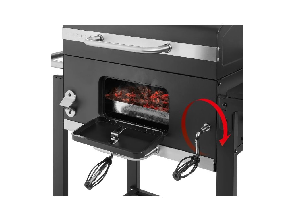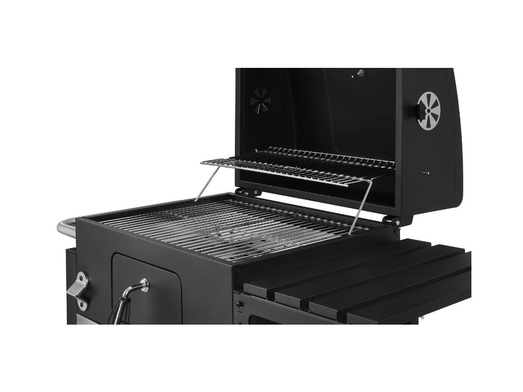 - Optimálna regulácia teploty vďaka 4 vetracím zarážkam, výškovo nastaviteľnej vaničke na drevené uhlie a výklopnému veku