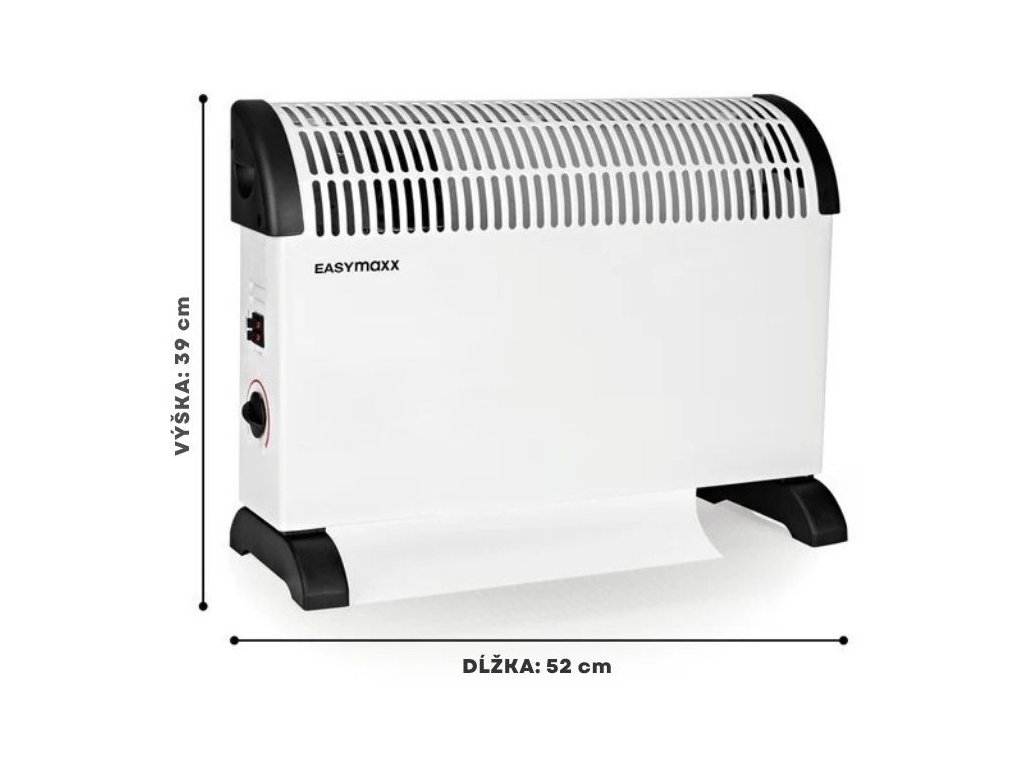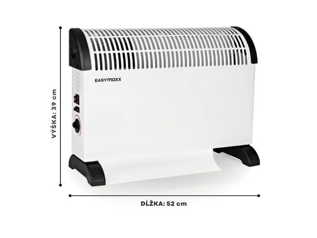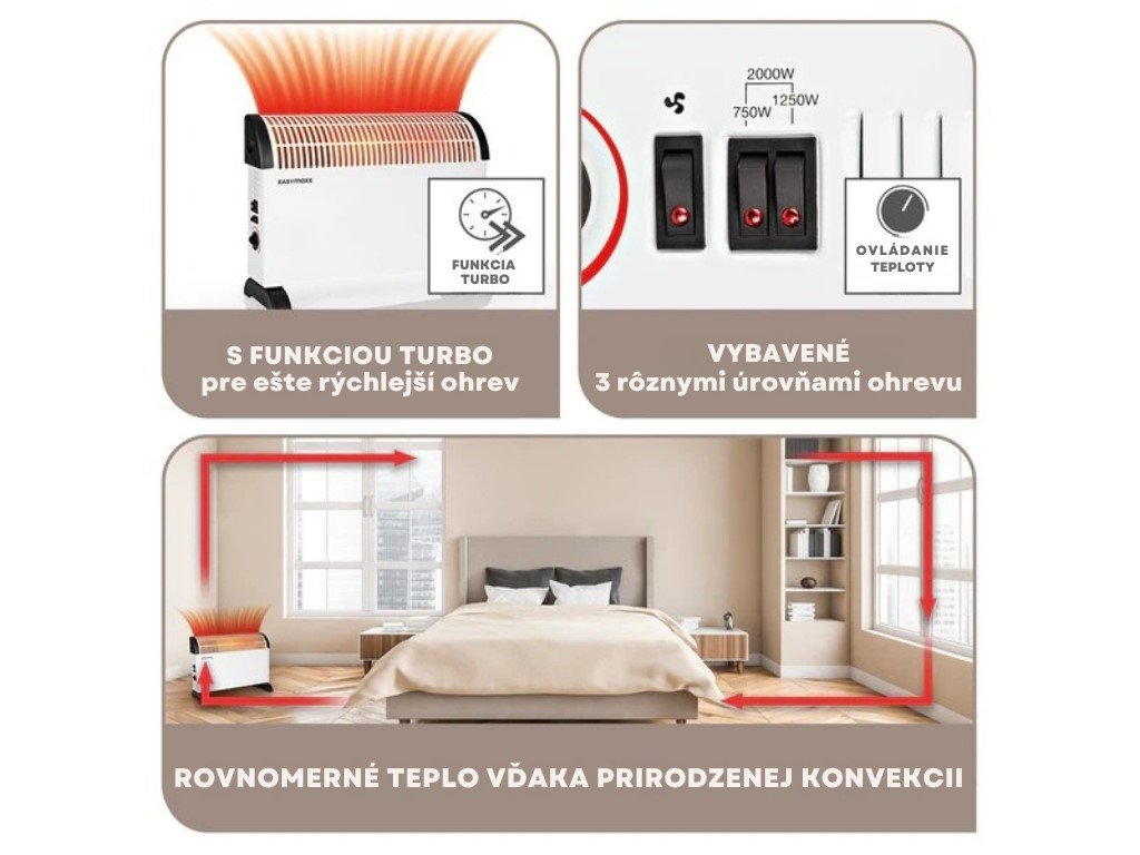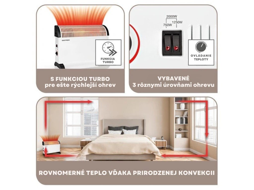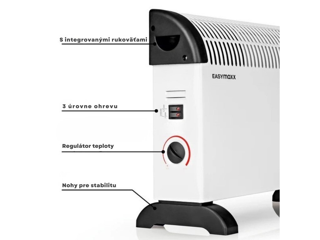 - Jednoduchá preprava : Vďaka integrovaným rukovätiam a stabilným nožičkám môžete konvektor ľahko premiestniť, kamkoľvek potrebujete.
