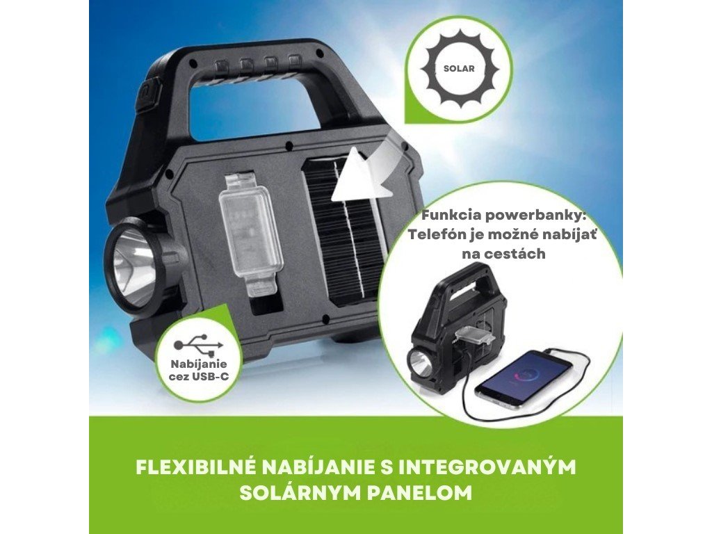 Jednou z kľúčových vlastností tohto svietidla je flexibilné nabíjanie . Môžete ju nabíjať pomocou integrovaného solárneho panelu, čo je ideálne na použitie na cestách, alebo pohodlne doma cez USB port typu C. Vďaka tomu sa nikdy nemusíte obávať, že zostanete bez svetla.