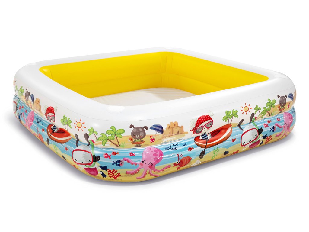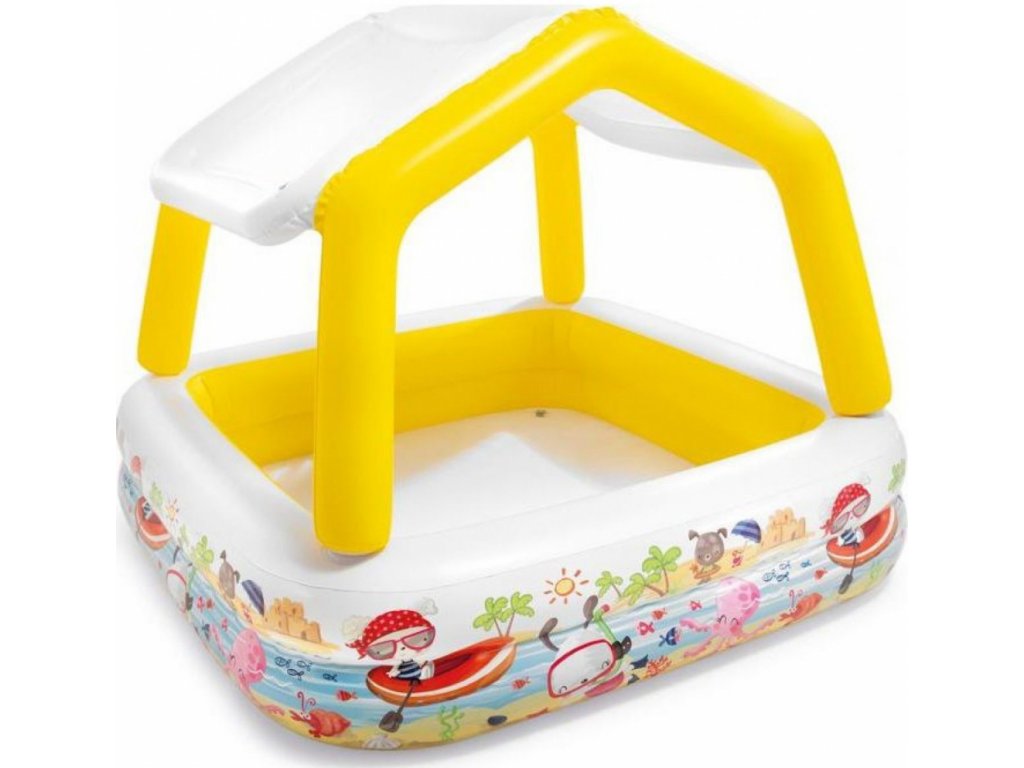 Nafukovací bazén s extra širokými bočnice a strieškou pre príjemný tieň pri vodných hrách vašich detí. Premeňte svoju záhradku v malej mora a potešte svojich najmenších. Strieška chráni pred slnkom, pripevňuje sa pomocou suchého zipsu. Vypúšťací ventil v podlahe. Opravná záplata súčasťou. Kapacita vody pri výške 24 cm je 280L.