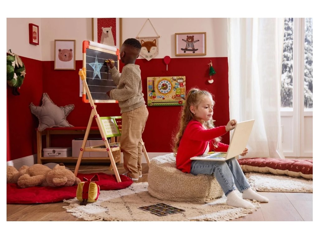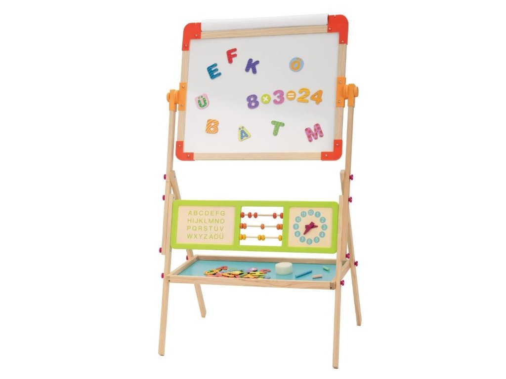 - Obojstranná tabuľa : Jedna strana je určená pre kriedy, druhá pre magnety, čo umožňuje deťom ľahko prepínať medzi rôznymi aktivitami.