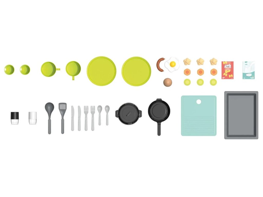 Okrem základných funkcií je kuchynka vybavená rozsiahlym príslušenstvom, ktoré zahŕňa všetko potrebné na hranie na kuchára. Deti sa môžu hrať s panvicou, hrncom s pokrievkou, obracačkou, vareškou a plechom na pečenie. Nechýba ani doštička na krájanie, poháre, hrnčeky, tanieriky, soľnička, korenička, nože, vidličky a lyžičky. Na realistické hranie sú k dispozícii aj potraviny ako klobása, vajcia, vyprážané vajcia, karfiol, cuketa, mrkva a krabičky na potraviny. Celkom 35-dielna sada zaručuje, že si každé dieťa nájde to svoje.