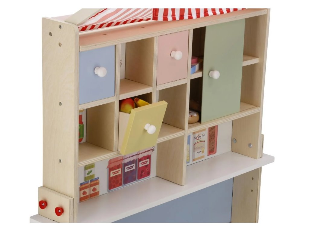 Drevený obchod pre deti od KidLand je vyrobený z kvalitného dreva, čo zaručuje jeho dlhú životnosť a bezpečnosť pri hraní. Jeho súčasťou je predajný pult, markíza, bočný pult, výklad, tri zásuvky a posuvné dvere, ktoré poskytujú dostatok úložného priestoru pre všetky detské poklady. Navyše je vybavený popisovateľnou ponukovou tabuľou s piatimi kriedami a hubou, čo umožňuje deťom rozvíjať ich kreativitu a komunikačné zručnosti.