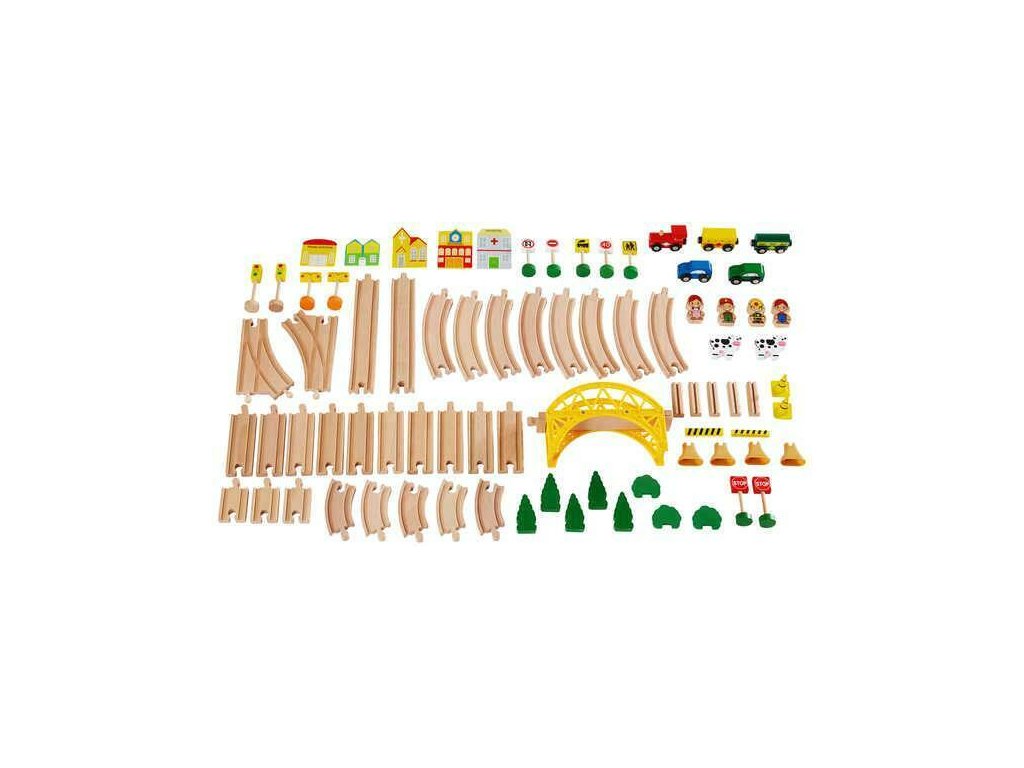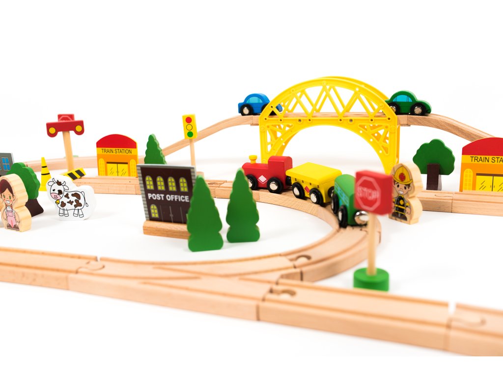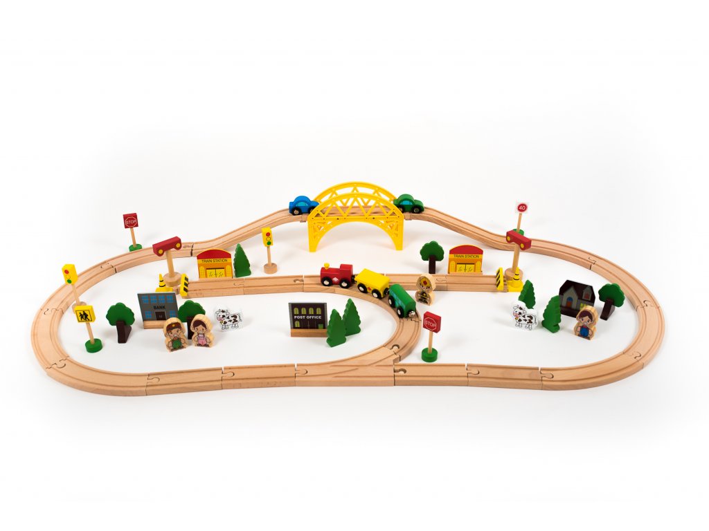 Drevená vláčkodráha s 80 dielmi, v ktorej nechýba mosty, nájazdy, návestidlá, semafory, budovy, cestné vozidlá či postavy.