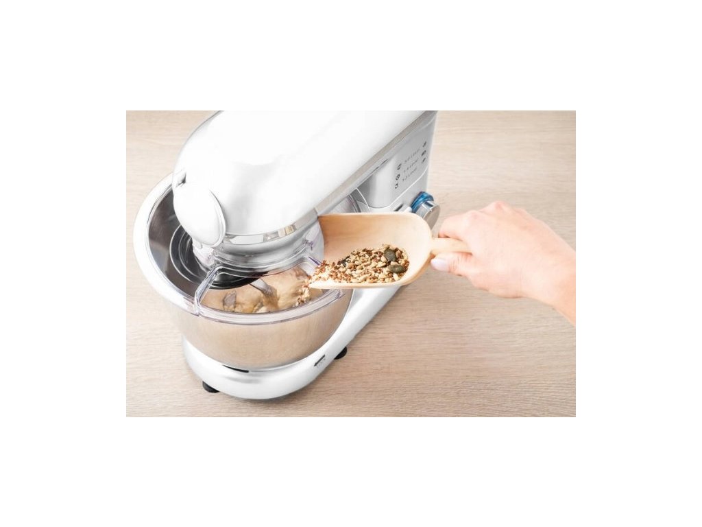 K mixéru dostanete aj užitočné príslušenstvo, ktoré vám uľahčí prevádzku. Príprava všetkých vecí bude prebiehať vo veľkej nerezovej miske, ktorá má objem 4,5 l. V prípade príprav tort či iných dobrôt, napríklad na rodinné oslavy, stretnutia s priateľmi a iné akcie, nemusíte mixovať dvakrát. Všetko sa zmestí do priestrannej misy. Máte obavy, aby bolo cesto rovnomerne rozmiešané po celej miske? Planetárny pohon zaženie vaše obavy. Pokryje celú misku a dosiahnete s ním vynikajúce výsledky. K mixéru dostanete 3 základné nástavce , a to sú metly z nehrdzavejúcej ocele, šľahač a hák na cesto z hliníka s nepriľnavým povrchom.
