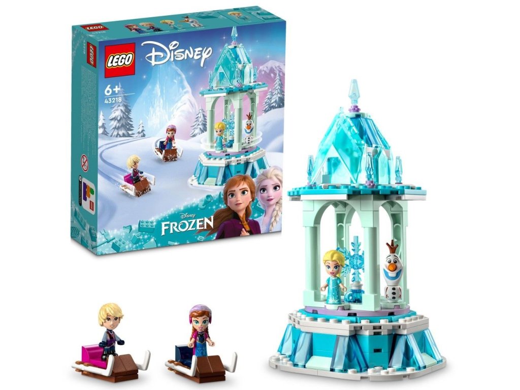 Nadchnite fanúšikov Disney filmov od 6 rokov krásnou stavebnicou LEGO® Disney 43218 Kúzelný kolotoč Anny a Elsy, ktorá sa hodí na hranie aj na výstavku. Hlavným prvkom je otáčajúci sa kolotoč inšpirovaný Elsiným ikonickým ľadovým zámkom a nechýbajú ani 2 miniatúrne sánky, 3 mikrobábiky LEGO a figúrka LEGO Olafa
