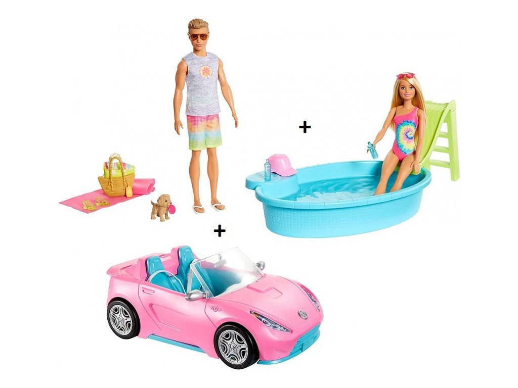 Mattel Barbie GJB71 Elegantný kabriolet + Barbie, bazén so šmykľavkou a Ken - chybí kryt kola