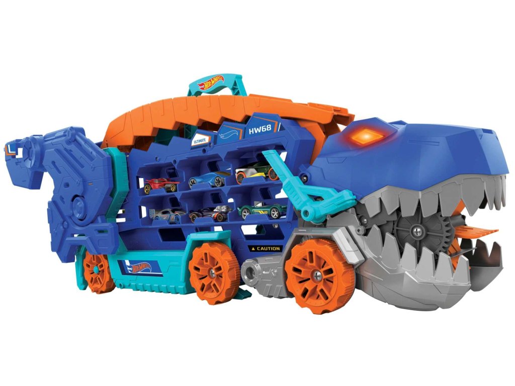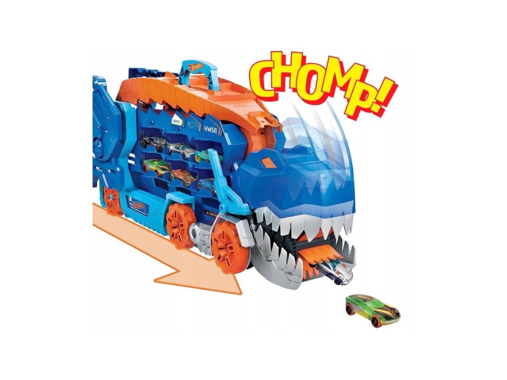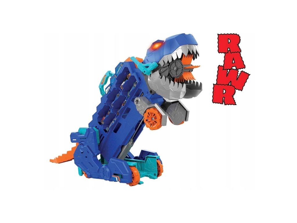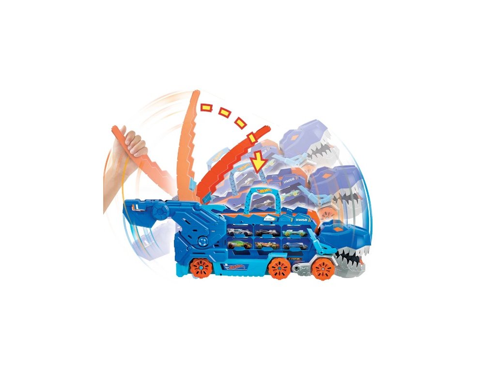 Hot Wheels™ City T-Rex ťahač so svetlami a zvukmi. Tento úžasný ťahač pojme viac ako 20 angličákov Hot Wheels®, ale tiež sa dokáže premeniť na T-Rexa, ktorý potom, čo zožerie autíčka, ich vykaká! Súčasťou balenia sú dva angličáky Hot Wheels®.