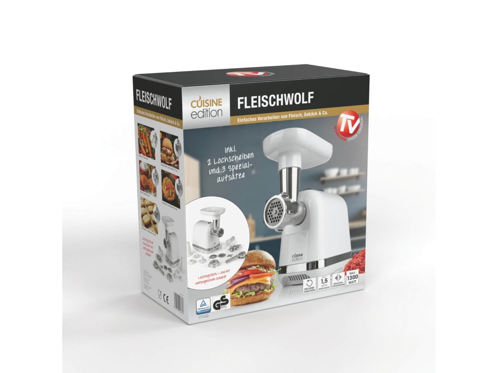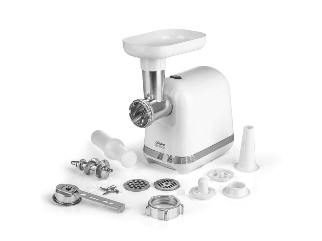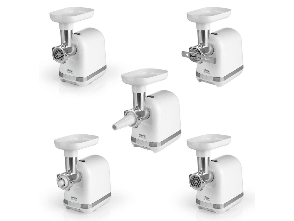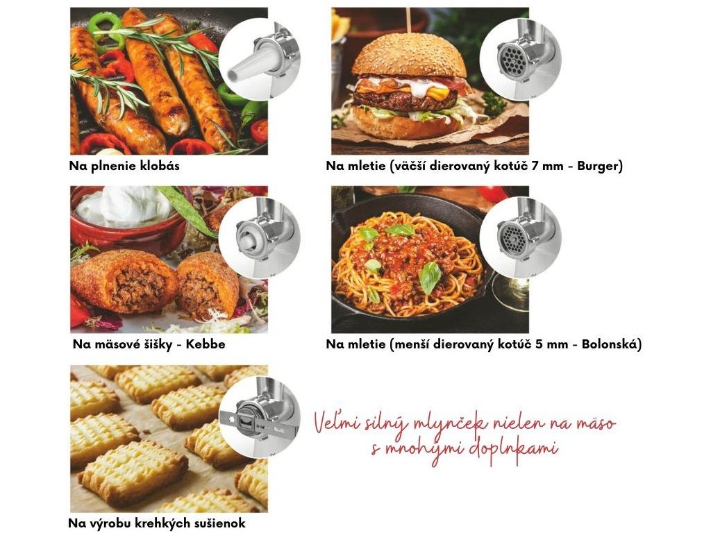Všestranné využitie tohto moderného spotrebiča ocení každý kuchársky nadšenec. Vďaka dierovaným kotúčom (5 a 7 mm) môžete pripraviť ako jemne, tak hrubo mleté mäso. výrobu domácich klobás, kebabu a krehkých sušienok .