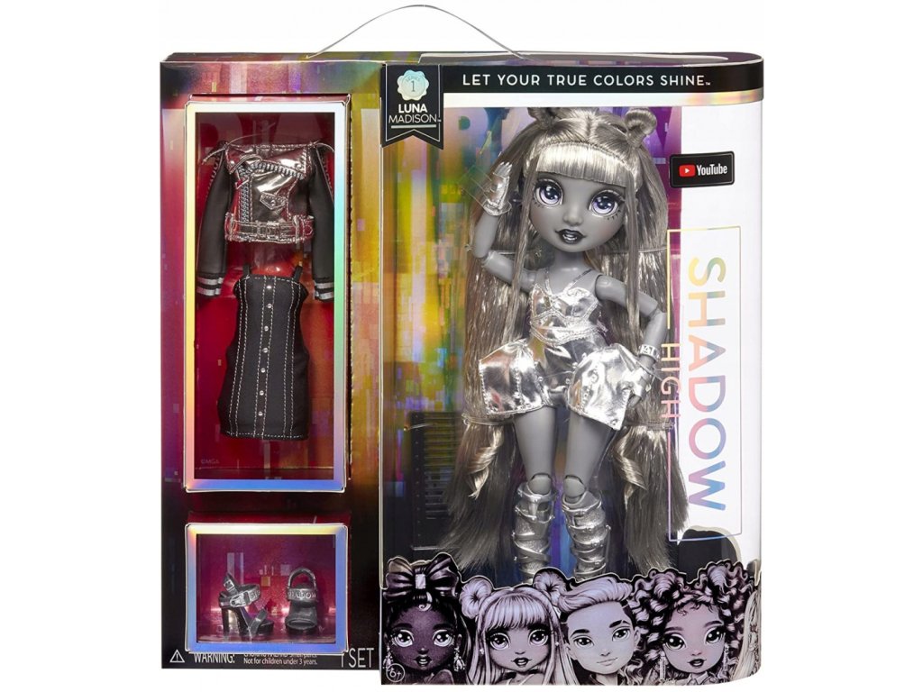 A máme tú konkurenčnú školu k Rainbow High! Tajomné bábiky Shadow High prichádzajú na scénu. Na druhej strane dúhy nájdeš 5 nových bábik a 1 chlapca v odtieňoch šedej. Bábika Luna Madison má dlhé česateľné vlasy a dlhé riasy. V balení nájdeš dva outfity a množstvo módnych doplnkov.