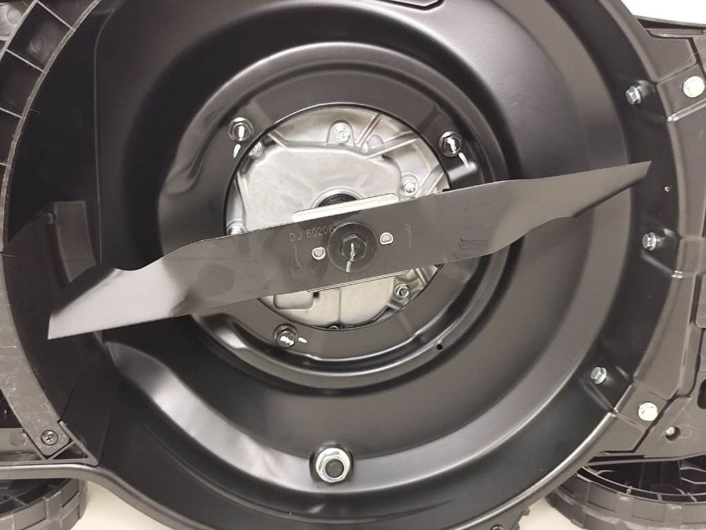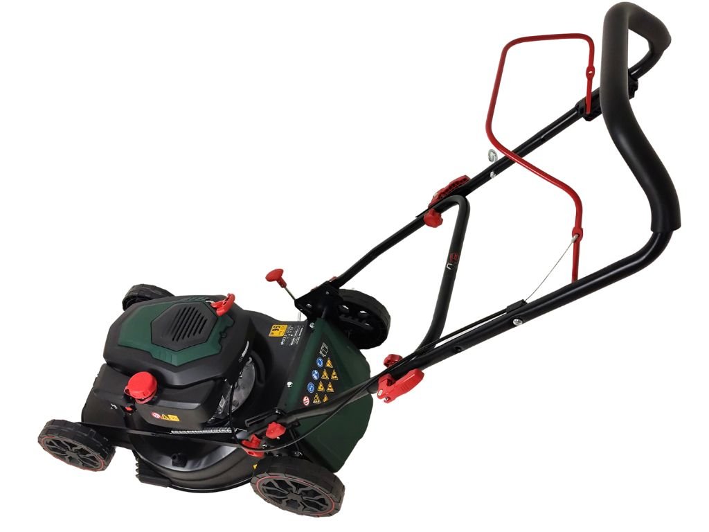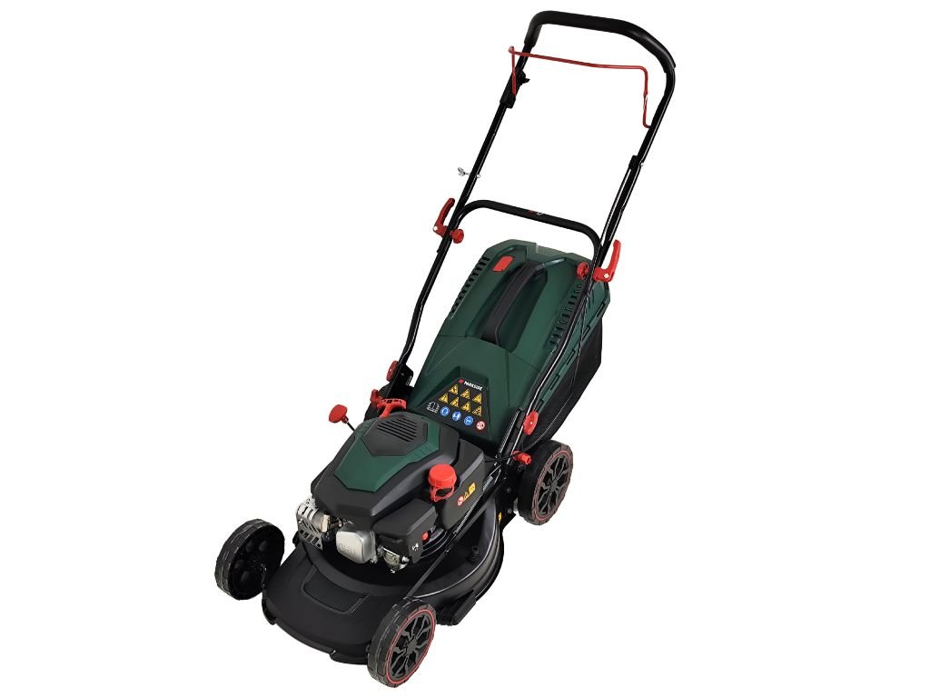 Telo kosačky je vyrobené z odolného oceľového plechu s práškovou vrstvou, ktorá zaisťuje dlhú životnosť a odolnosť proti poveternostným vplyvom. Kosačka je vybavená 45-litrovou záchytnou nádobou s ukazovateľom stavu naplnenia a praktickým držadlom pre jednoduchú manipuláciu. Navyše je vodiace držadlo výškovo nastaviteľné a výklopné, čo uľahčuje skladovanie a šetrí miesto.
