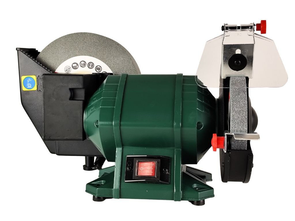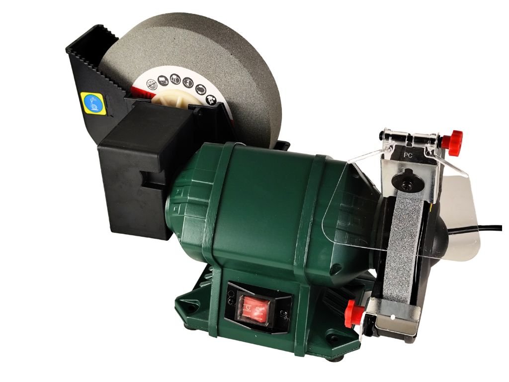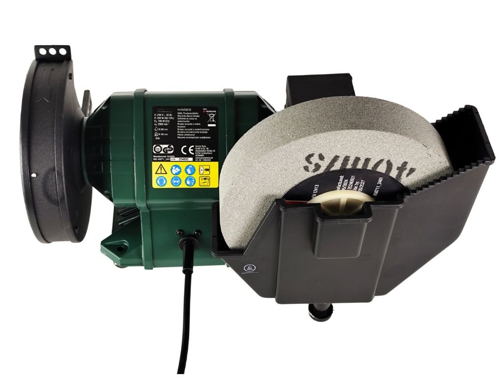 Táto brúska je vybavená pomaly bežiacim kotúčom na mokré brúsenie s nehrdzavejúcou nádržkou na vodu, čo je ideálne na jemné a presné úpravy. Rýchlo bežiaci kotúč na suché brúsenie je opatrený nastaviteľným krytom proti iskrám, čo zvyšuje bezpečnosť pri práci. Vďaka vypínaču chránenému proti striekajúcej vode je brúska bezpečná aj v náročnejších podmienkach.