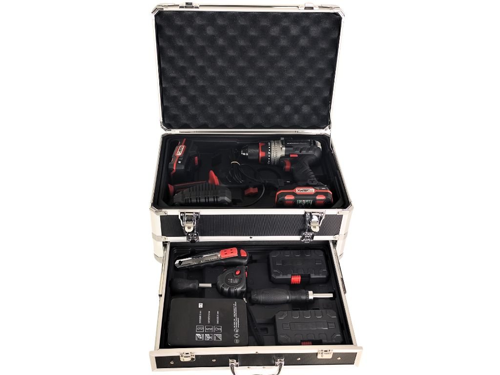 Táto vŕtačka prichádza s kompletnou sadou príslušenstva, vrátane dvoch 2 Ah akumulátorov a nabíjačky. Sada obsahuje aj 98-dielne príslušenstvo, ktoré zahŕňa vrtáky do rôznych materiálov, skrutkovač a ďalšie praktické nástroje. Všetko je úhľadne uložené v kvalitnom kufri s hliníkovým rámom.