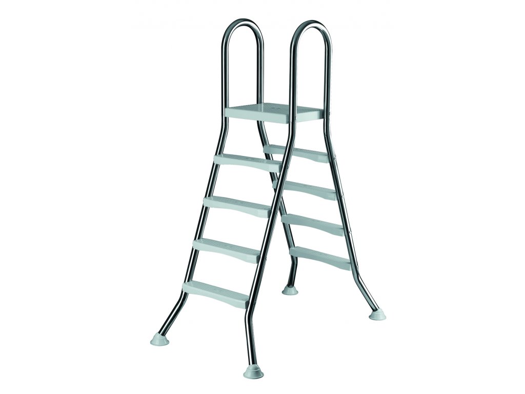 Bazénový rebrík pre bazény so stenou až 122 cm, vyrobený z kvalitnej nerezovej ocele, ktorá zaistí jeho dlhú životnosť. Rebrík má silné stabilné plastové schodnice a plošinu, udrží hmotnosť až 150 kg. Rebrík má 4 stupne na vnútornej a vonkajšej strane. Nohy rebríka sú zakončené koncovkami z protišmykovej gumy so stabilnou podložkou, ktoré zabraňujú nechcenému pohybu rebríka a zvyšujú tak bezpečnosť. Zároveň zabraňujú poškodeniu vášho bazéna.