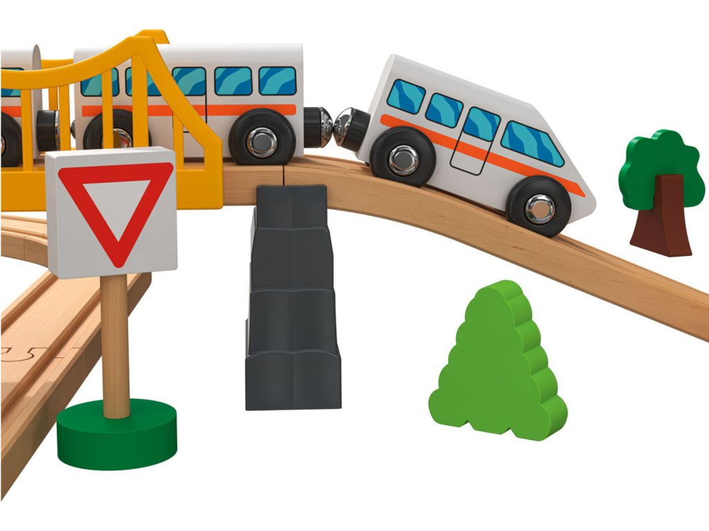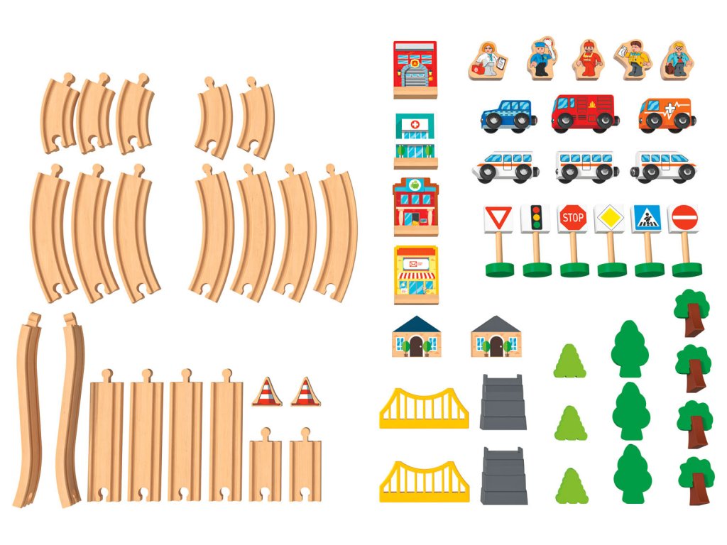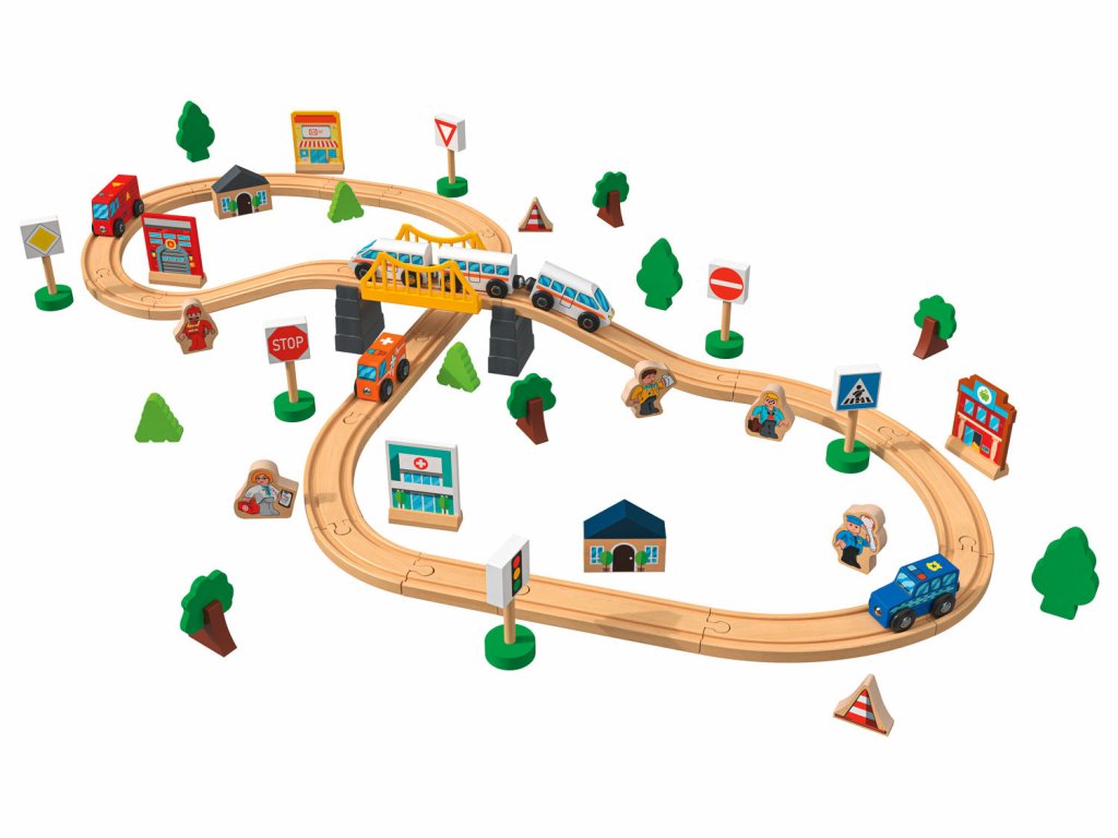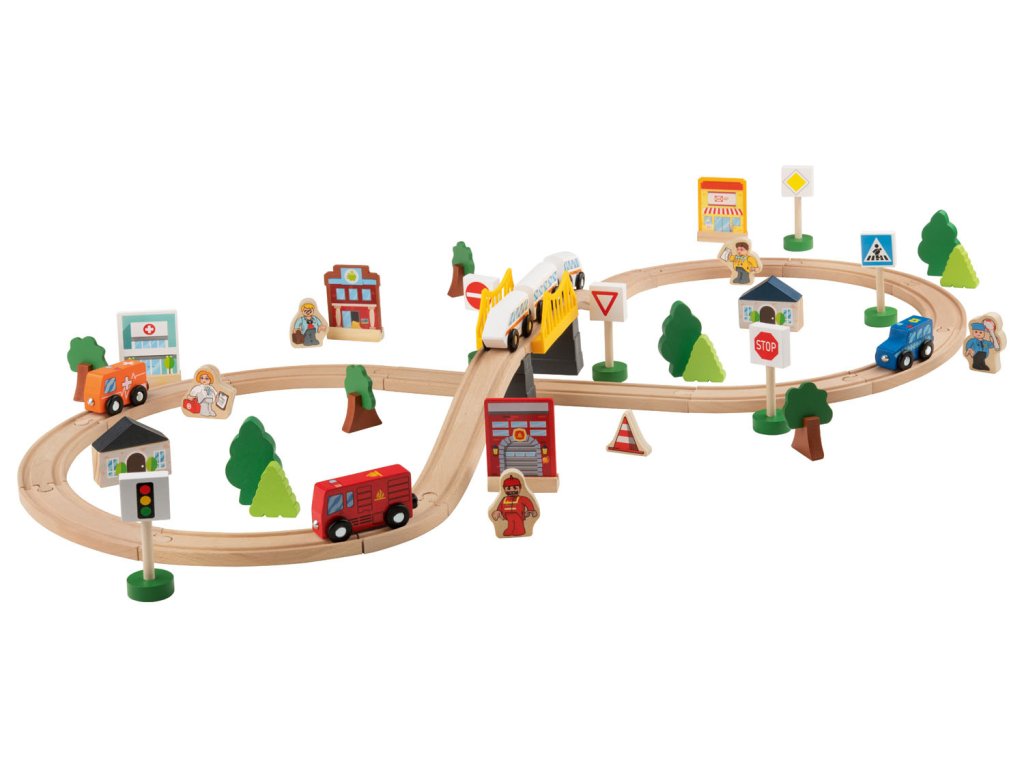 Drevená vláčikodráha so 67 dielmi, v ktorej nechýba most, zastávka, veterný mlyn, postavy, zvieratá či autá. Len u nás skladom a za najnižšiu cenu na trhu! Jedná sa o najlacnejšiu vláčikodráhu daných rozmerov a parametrov.