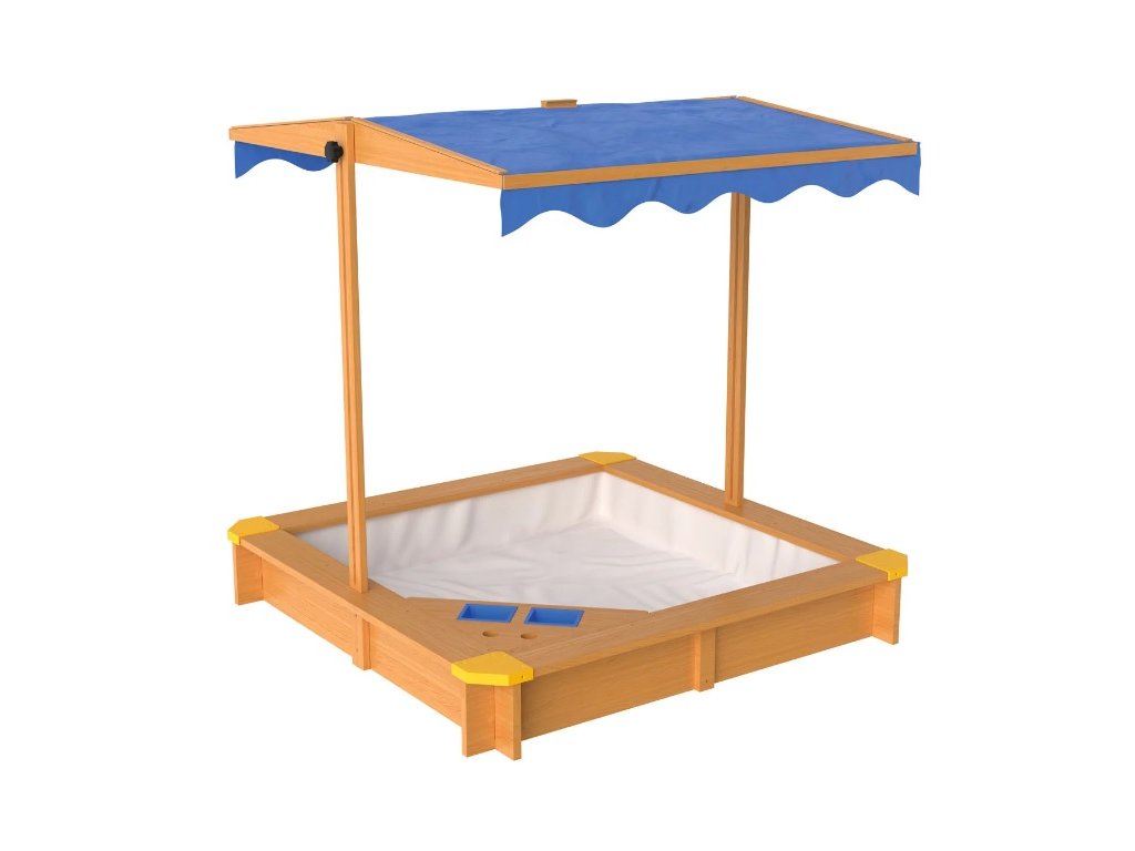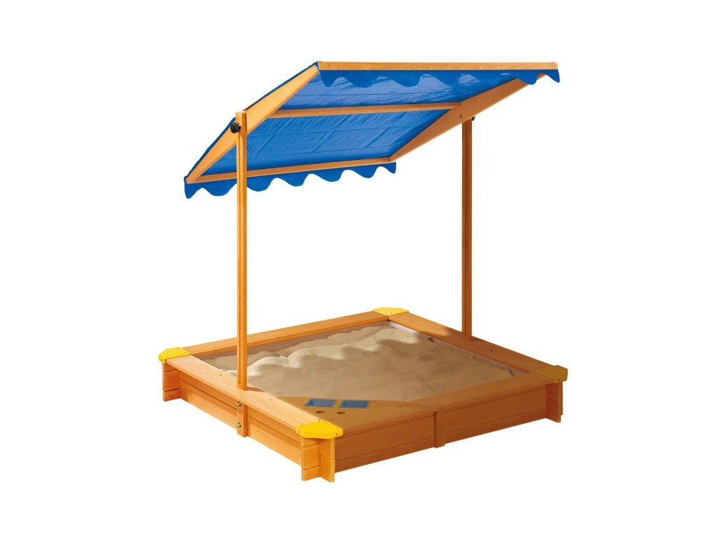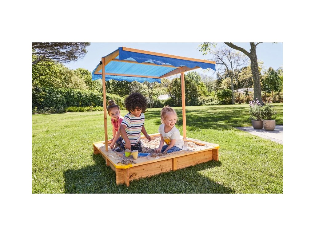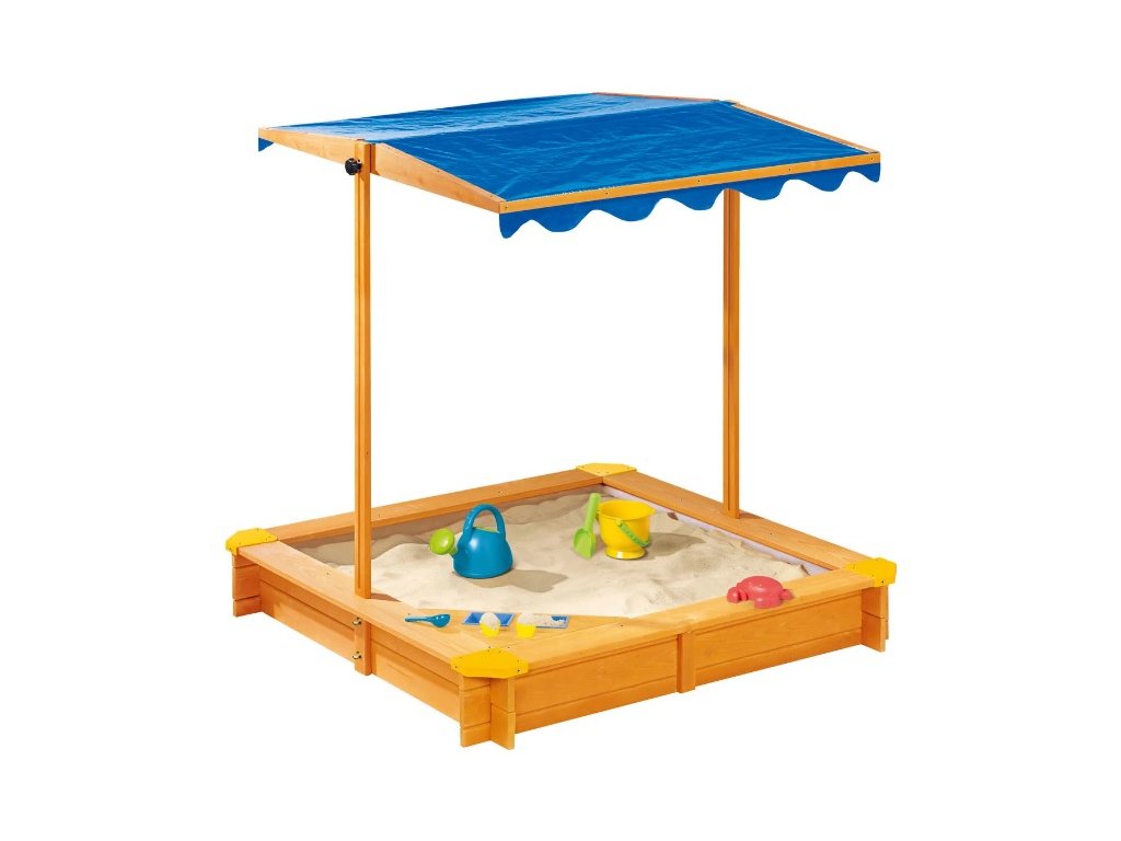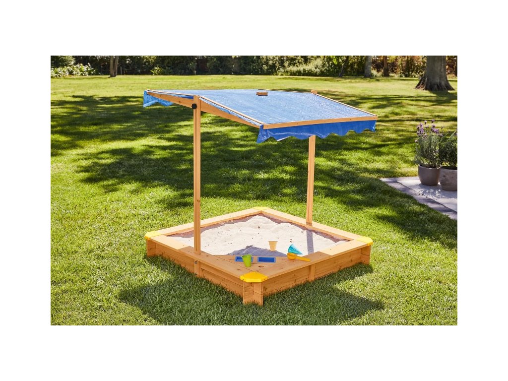 Pieskovisko je vybavené podlahovou plachtou odolnou voči koreňom , ktorá prepúšťa vodu, čo znamená, že sa nemusíte obávať o jeho údržbu ani v daždivých dňoch. Na výšku nastaviteľná a naklápacia strecha poskytuje ochranu pred UV žiarením, dažďom, listami a zvieratami, čo zaisťuje, že deti môžu hrať za akéhokoľvek počasia.