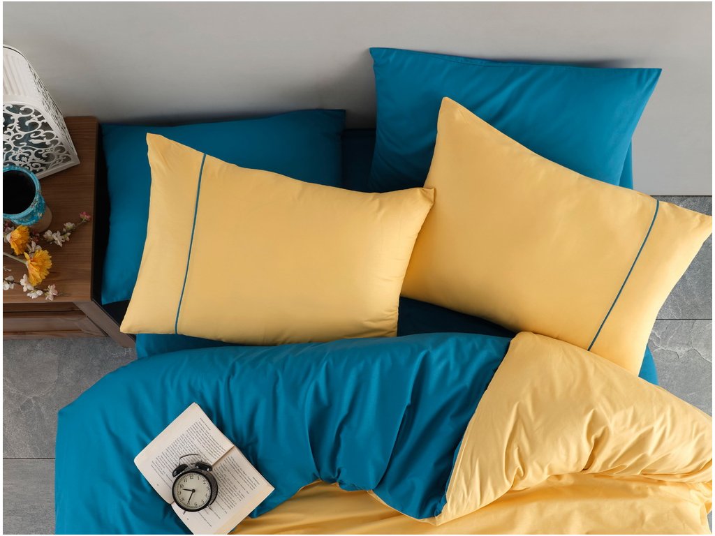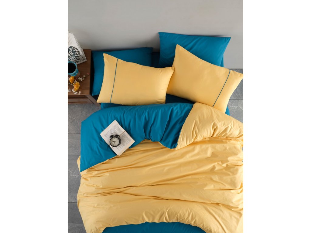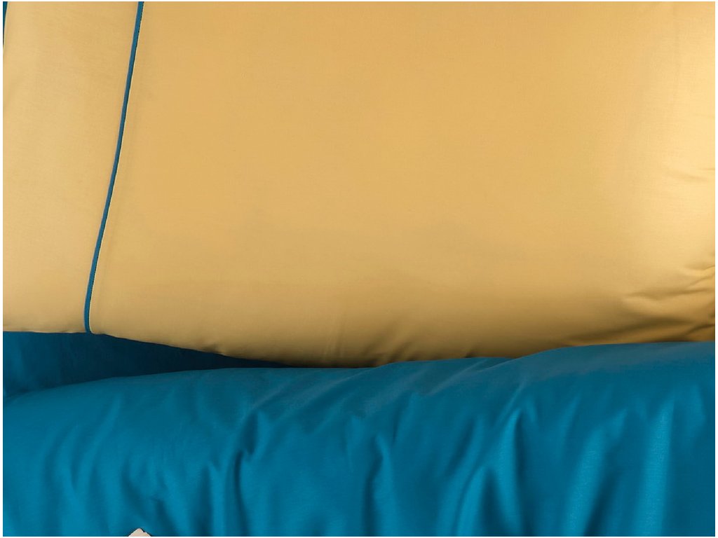 Moderné a svieže obliečky zo 100% bavlny Renforcé. Nevšedne nápadité hladké, jednofarebné, napriek tomu dvojfarebné obliečky. Oku lahodiaca farebná kombinácia, ktorá poteší ako ženy, tak mužov. Obliečka na perinu je z jednej strany sýto žltá, z druhej modrá. Vankúše sú z oboch strán žlté s elegantným modrým prúžkom.