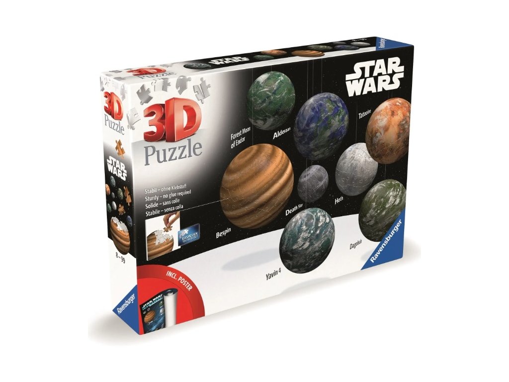 Objavte Ravensburger 3D Puzzle Star Wars Galaxie s 531 kusmi, zahŕňajúce realistické modely 8 ikonických planét ako Hviezda smrti a Tatooine. Puzzle sú vyrobené z vysoko kvalitných plastových dielikov s technológiou Easyclick pre jednoduché skladanie bez lepenia , ideálne pre deti od 6 rokov a poskytujú zábavu a kreatívny rozvoj.
