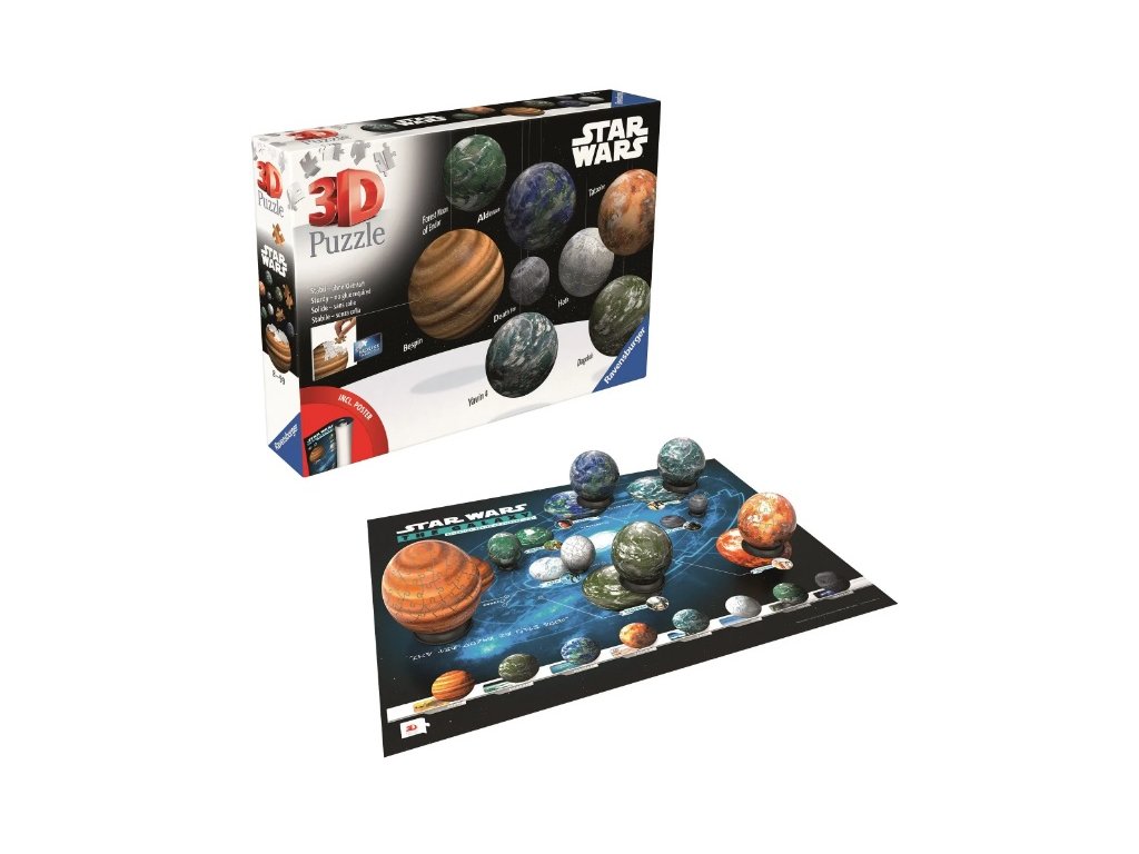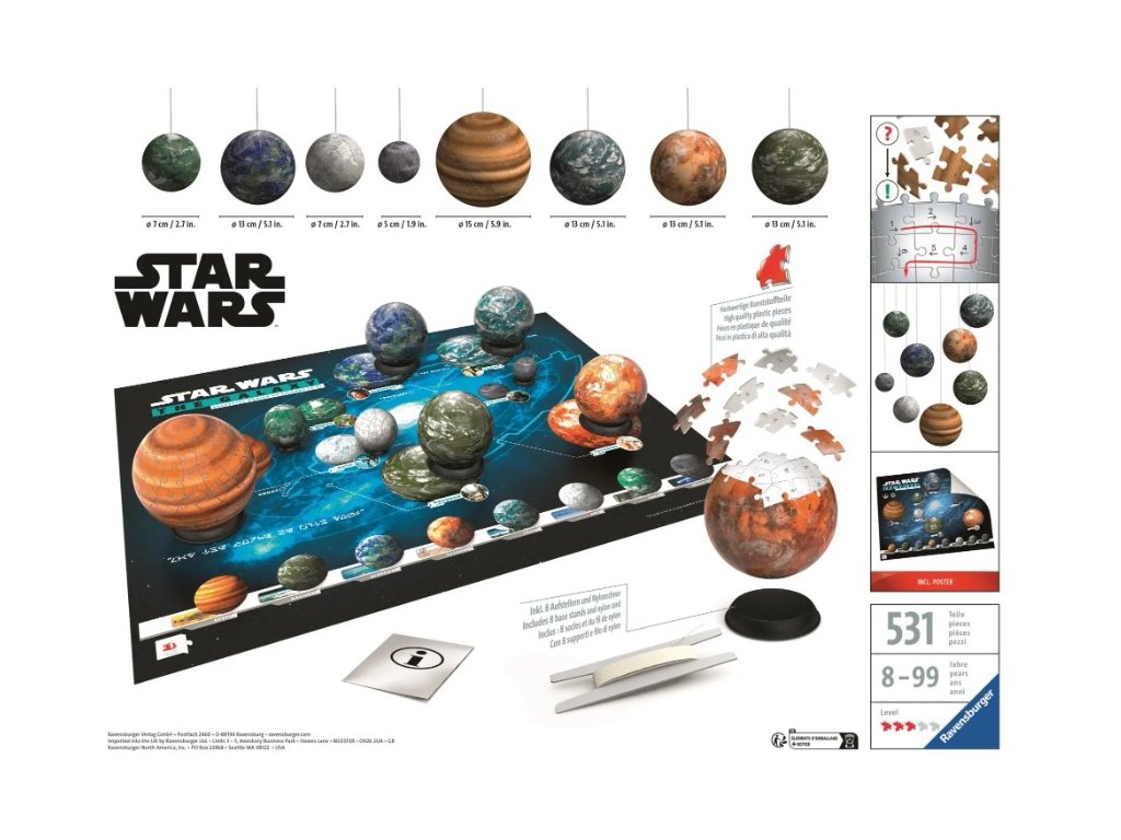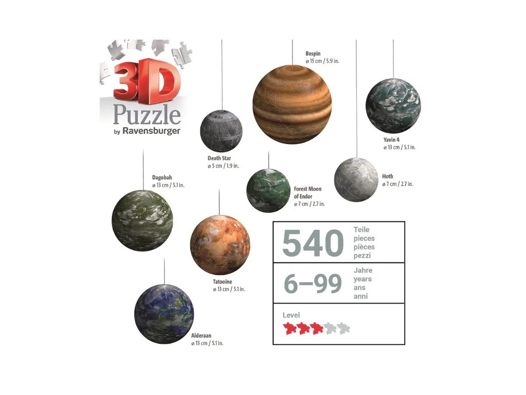 Objavte Ravensburger 3D Puzzle Star Wars Galaxie s 531 kusmi, zahŕňajúce realistické modely 8 ikonických planét ako Hviezda smrti a Tatooine. Puzzle sú vyrobené z vysoko kvalitných plastových dielikov s technológiou Easyclick pre jednoduché skladanie bez lepenia , ideálne pre deti od 6 rokov a poskytujú zábavu a kreatívny rozvoj.