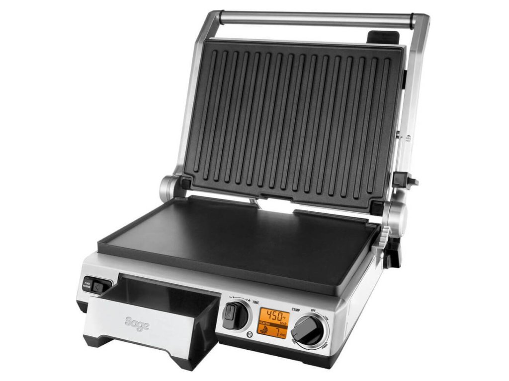 So všestranným kontaktným grilom Sage BGR820 dokážete pripraviť lahodné pokrmy behom chvíľky sami, a to bez pridania jedinej kvapky tuku! Gril Sage je možné použiť aj ako otvorený, kedy získame 2 grilovacie dosky. Povrch dosiek je vyrobený z materiálu Quantanium, čo je nepriľnavý materiál. Senzor Element IQ detekuje pokles teploty a vyrovnáva teplo pri grilovaní. Teplotu nastavíte v rozsahu 160 až 230 °C a môžete si vybrať jednotky °C alebo °F. Režimy grilu sú: LOW, PANINI a Sear. Podsvietený LCD displej zobrazuje teplotu, pripravenosť a dobu časovača. Výhodou je aj nastavenie sklonu hornej dosky, čo umožní odviesť prebytočný tuk z pripravovaného jedla priamo do vyberateľnej odkvapkávacej misky.