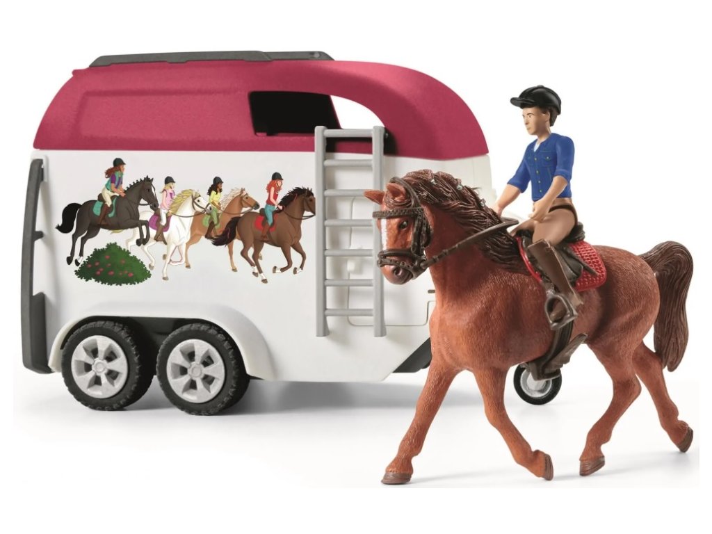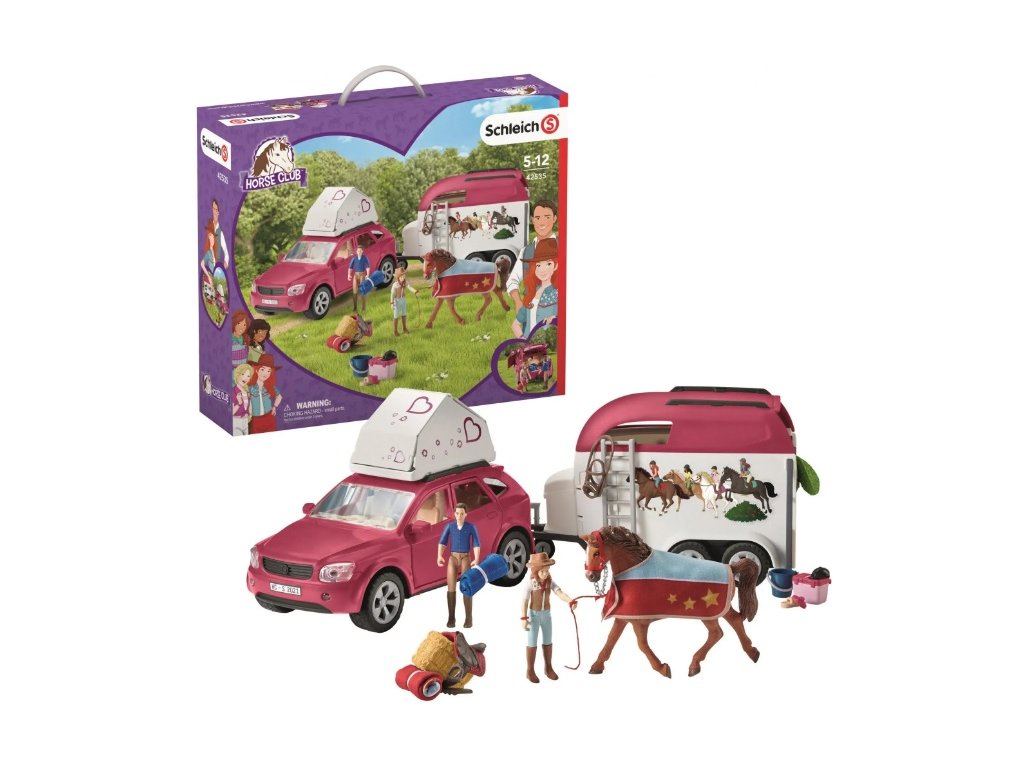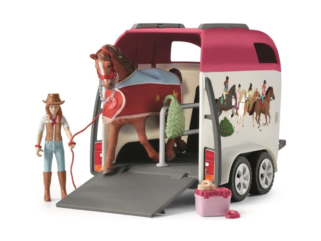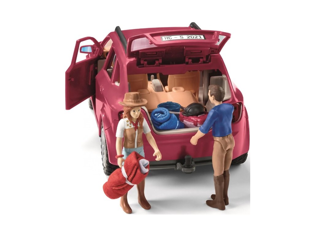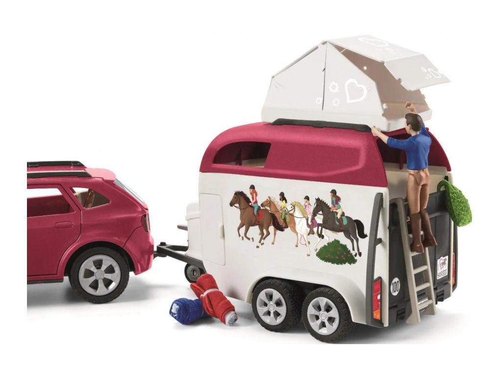 Hannah a jej otec vlastní úžasné vozidlo s koňom od Schleich® Horse Club! Toto vozidlo ponúka množstvo funkcií , ktoré rozširujú možnosti hry. V priestrannom SUV možno sedačky sklopiť , čo umožňuje pánovi Kramerovi zbaliť mnoho predmetov ako skladací stan a bohaté jazdecké príslušenstvo, vrátane helmy, sedla, uzdečky, vedra a boxu na starostlivosť obsahujúceho masážnu kefu a hrebeň .