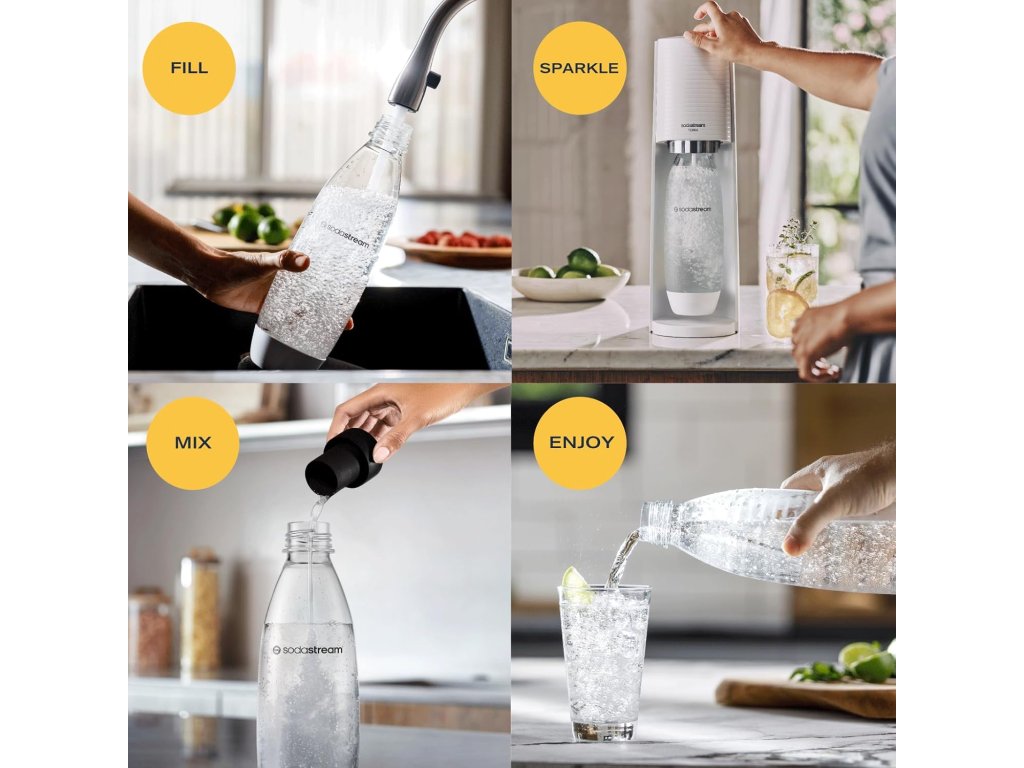 Na rozdiel od konkurencie, SodaStream Terra ponúka nielen štýlový dizajn, ale predovšetkým jednoduchú a rýchlu obsluhu , ktorú ocení celá rodina. Pripravte si perlivú vodu kedykoľvek počas dňa a vychutnajte si ju bez zbytočného odpadu z plastových fliaš. Navyše, všetky fľaše v balení sú vhodné do umývačky, čo uľahčuje ich údržbu.