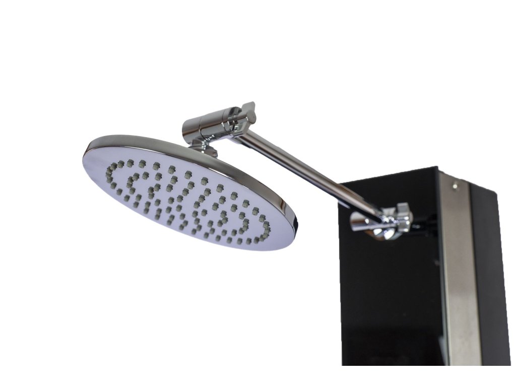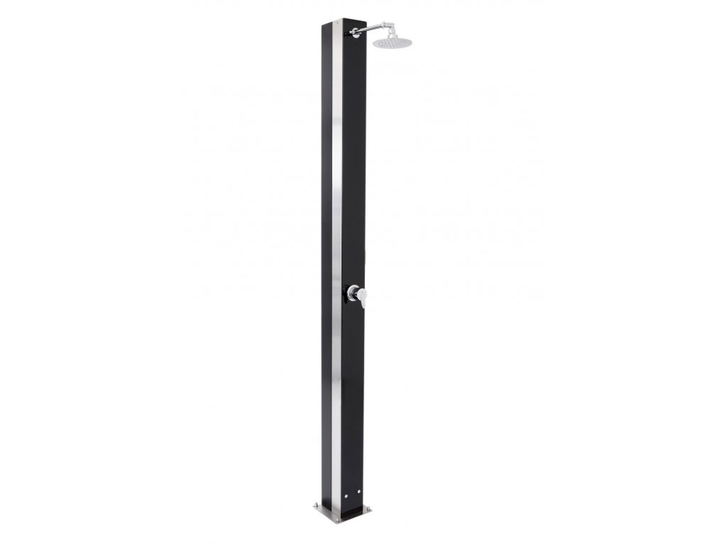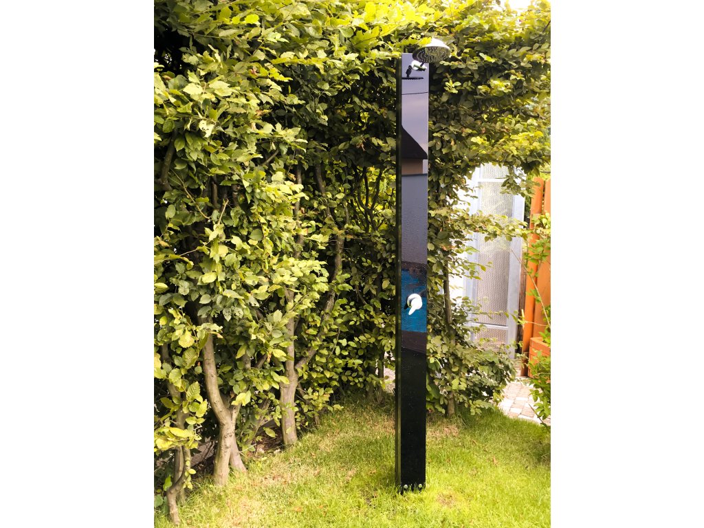 Prémiová solárna sprcha vyrobená z kvalitných materiálov - skla, hliníka a nerezovej ocele. Čelnú časť sprchy tvorí čierna sklenená doska, telo sprchy je vyrobené z nerezovej ocele, zadnú časť tvorí hliníkový solárny zásobník na vodu s objemom 18 l. Sprcha je vyrobená v Nemecku a má vysokú úroveň spracovania. Sprcha sa svojim decentným elegantným vzhľadom hodí ku všetkým prémiovým bazénom alebo do upravených záhrad, kde bude vkusným doplnkom. Sprcha je vybavená veľkou sprchovacou hlavicou, ktorá zaisťuje príjemné sprchovanie pripomínajúce ľahký letný dáždik a je vysoká 210 cm.