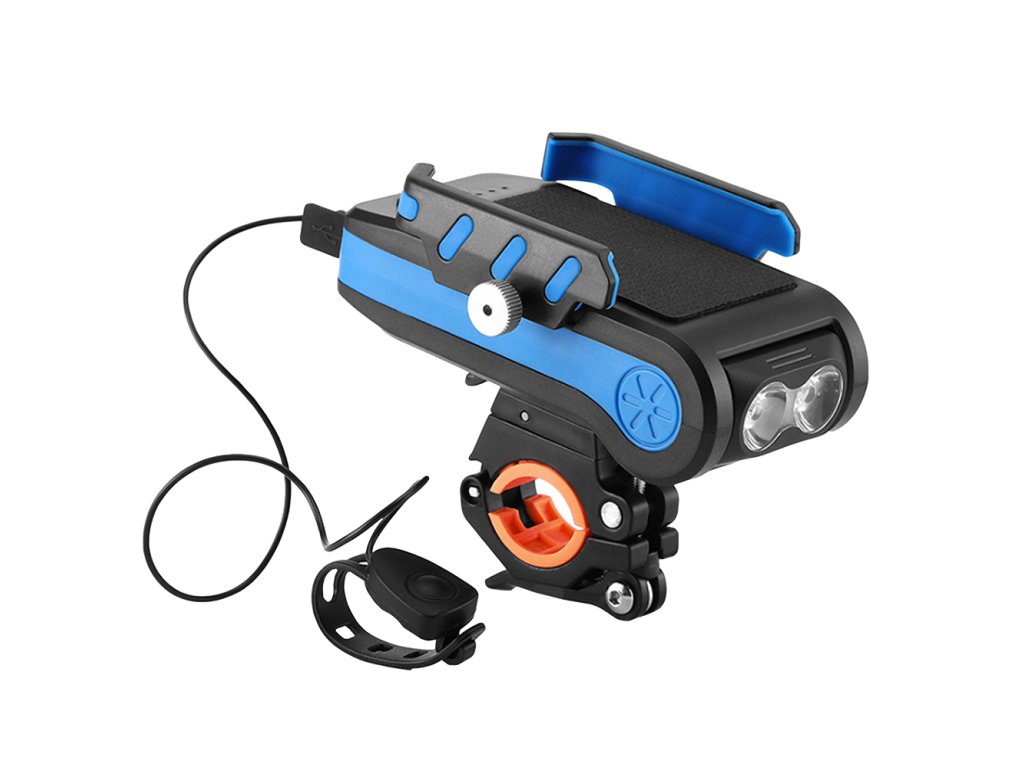 Perfektné predné svietidlo na bicykel 4v1! okrem výkonného LED osvetlenia, ktoré v tme dosiahne až 200 metrov pred bicykel, slúži zároveň ako držiak na mobil a ako powerbanka, teda nabíjačka Vášho telefónu. Elektronický klaksón s 5 rôzne voliteľnými zvukmi je už čerešnička na torte.