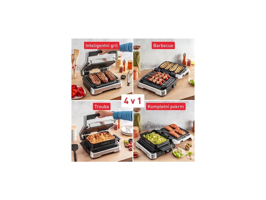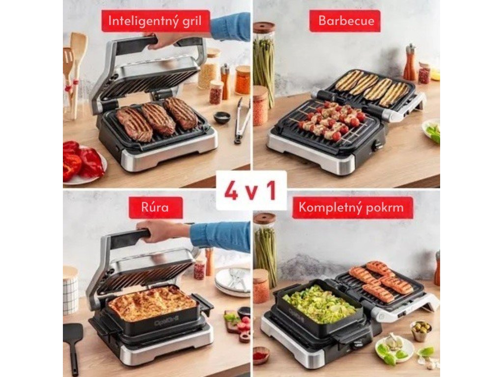 S funkciou 4 v 1 môžete tento gril použiť ako kontaktný gril, barbecue, rúru alebo pomocníka na prípravu kompletných pokrmov. Grilovacie dosky sú nepriľnavé a ľahko odnímateľné, čo zaisťuje ľahkú údržbu. Naklonené dosky navyše umožňujú prípravu pokrmov s až o 44% menej tuku, čo oceníte pri každodennom varení.