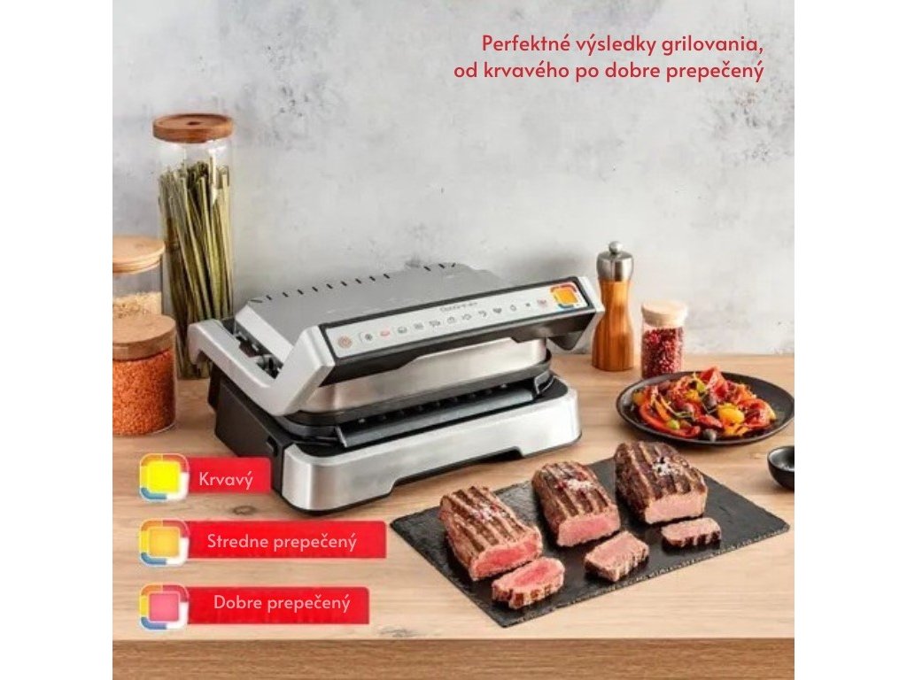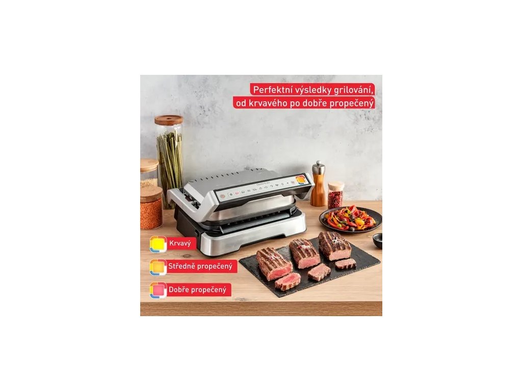 Gril je vybavený funkciou merania hrúbky suroviny s presnosťou na milimeter, čo umožňuje automatické prispôsobenie doby prípravy. Vďaka farebnému indikátoru budete mať vždy prehľad o stave vášho pokrmu. Už žiadne premýšľanie, kedy je mäso prepečené - OptiGrill to vie za vás!