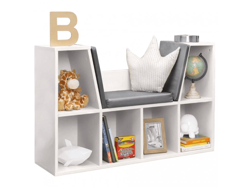 Veľmi podarená knižnica, či ak chcete otvorená komoda s príjemným posedením. Trojica mäkkých podušiek v šedej farbe sú súčasťou balenia. Ďalej sa komodka skladá zo šiestich výklenkov, kedy do spodných štyroch dáte, vďaka šírke každej police 30 cm, klasické boxy na uloženie hračiek, či iných nevyhnutností. Veľmi vhodné ako do detskej izby, tak aj do herničiek, do škôlky, či klubovne. Dodávané v demonte.
