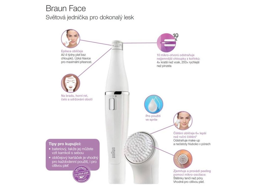 Nasadením čistiacej kefky jednoducho a rýchlo zbavíte pleť make-upu aj ďalších nečistôt . Až 6x účinnejšie ako ručné čistenie a vhodný na použitie s čistiacim gélom či krémom . Epilátor Braun Face 830 je navyše vodeodolný , a tak si môžete dopriať krásu aj vo vani alebo sprche .