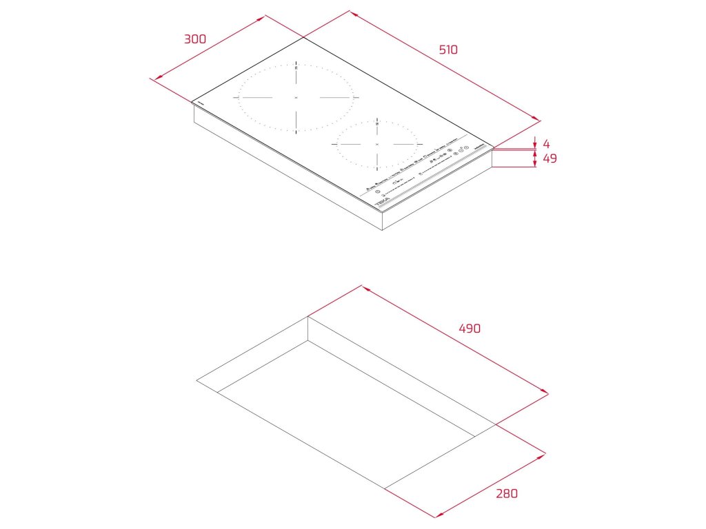 - Zabrúsené sklo, predná skosená hrana 2 varné zóny: 1 indukcia O 215 mm, 1 indukcia O 150 mm