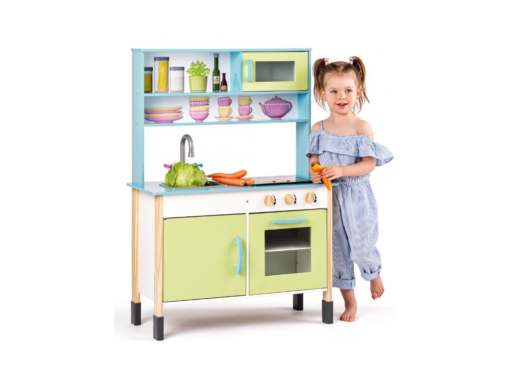 Táto drevená detská kuchynka výraznej pistáciovej farby je vybavená dvoma poličkami , otváracími dvierkami pri rúre, mikrovlnnej rúry a skrinky pod drezom, a otočnými gombíkmi pri varnej doske aj drezovej batérie.