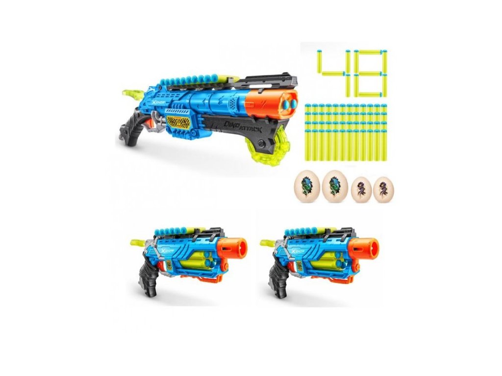 Pozor! Dinosaury útočia! Zničte ich vajcia a zabráňte ich ďalšiemu množeniu. Tieto jedinečné zbrane vám poskytujú viac zábavy. Pozvite k hre aj svojich kamarátov. Vďaka tejto skvelej sade s tromi zbraňami môžete byť minimálne 3! A to potom bude tá pravá zábava.