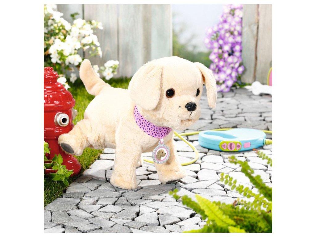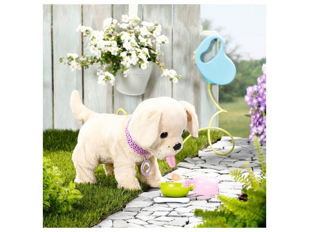 Náš psík Baby Born chodí na vodítku a reaguje na podnety. Keď ho pohladíte po chrbte, jeho chvostík začne vrtieť a budete počuť roztomilé psie zvuky. Vďaka funkcii pitia z mištičky sa deti môžu tešiť na realistické hranie – psík skloní hlavu, vyplázne jazyk a počujete, ako srká vodu. Po napití zdvihne nožičku a vyciká sa, čo sprevádza štekaním.